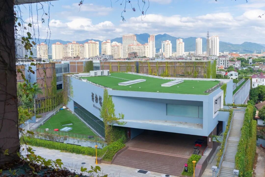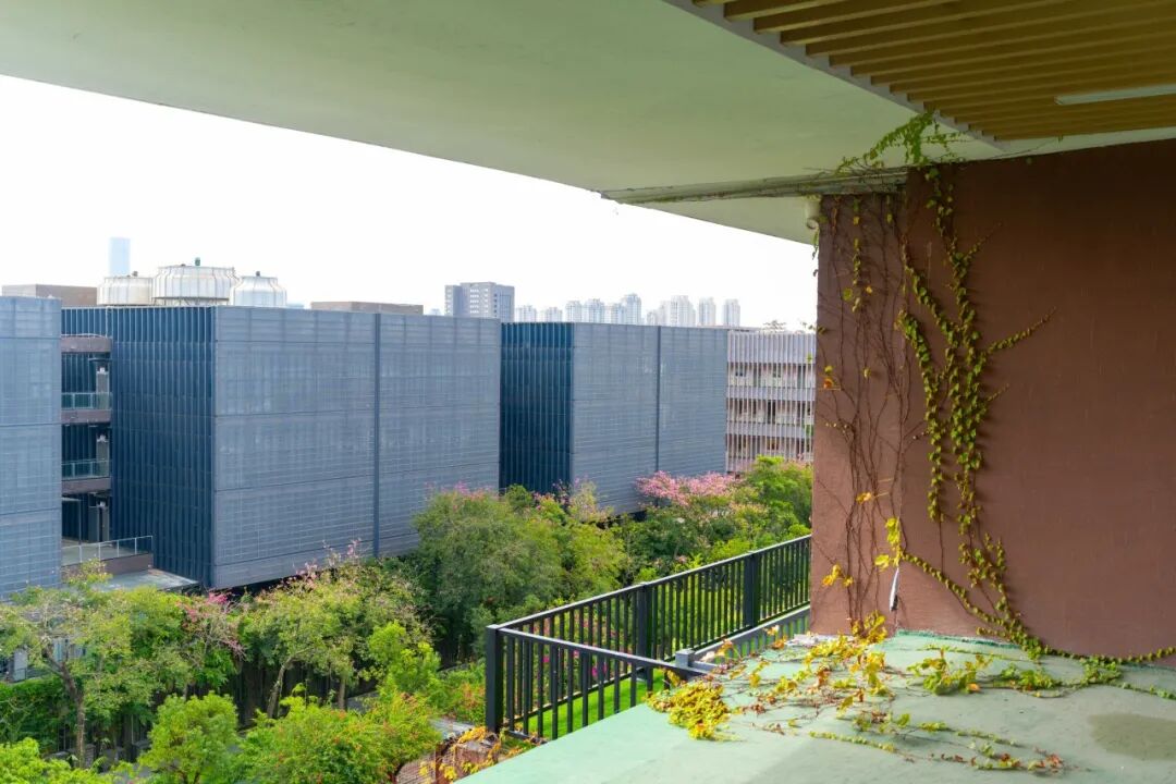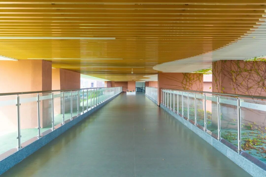 信步走到廊道中间驻足,才算懂了“阅山读海”的真意:由北侧俯瞰,教育博物馆的清新淡蓝,与日新大厦的红窗绿藤,依偎挨在一起,相映成趣;远处,天马山的绿意在高楼大厦间倾泻而出,郁郁葱葱像泼了墨的画,偶有云影掠过,山景便又换了一幅。