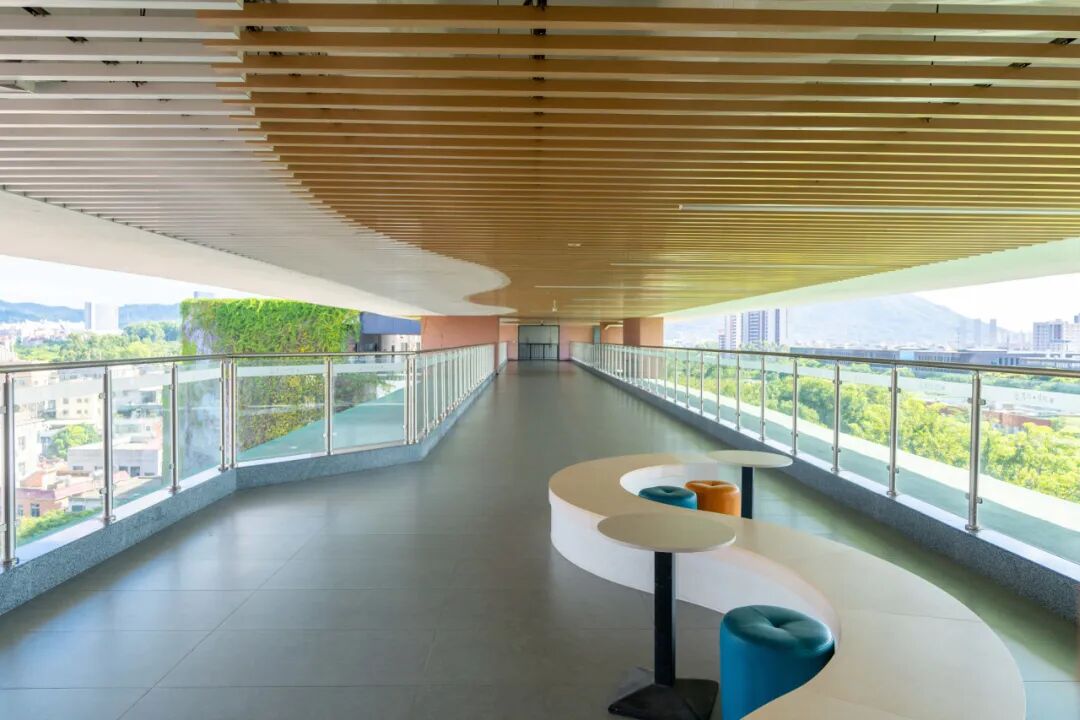晨光初醒,一道长达四十余米的空中廊道如轻盈的纽带,静静地连接厚德与怀德两座大厦。清透的玻璃栏杆将晨曦揉碎成金,洒满通廊;白色与原木格栅勾勒出流畅的S型弧线,如知识长河在头顶舒展铺陈——这里就是阅山读海阁。