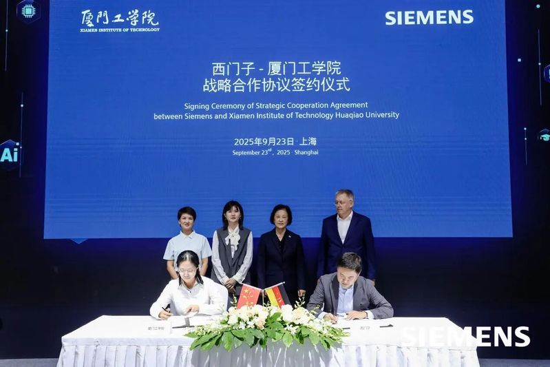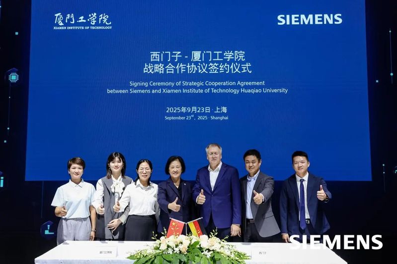 2025年9月23日,第25届中国工博会开幕首日,厦门工学院与西门子(中国)有限公司在国家会展中心(上海)举行战略合作协议签约仪式,双方就工业智造产业学院共建开展深度合作升级。西门子(中国)有限公司数字化工业集团高级副总裁兼华南大区总经理李士光与厦门工学院工业智造产业学院执行院长高丽贞代表双方签约,西门子(中国)有限公司高级副总裁兼大中华区数字化工业集团财务总监盖悟威博士(Dr.Uwe Gerecke)、西门子(中国)有限公司数字化工业集团华南区广东西地区总经理邝敏杰、西门子创新与人才发展市场总监柴琳与厦门工学院副校长李咏梅、工业智造产业学院副院长陈珍姗共同见证签约。