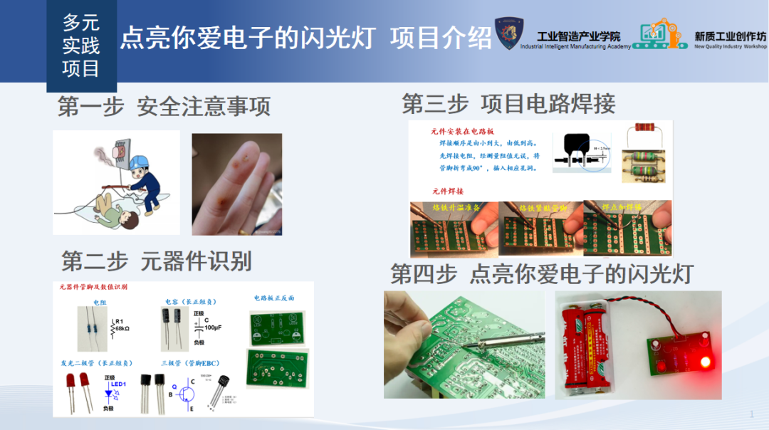 零基础上手,2学时从认零件、学焊接入手,用三极管、电阻、LED焊出交替闪烁的电路板,体验电子技术的乐趣。