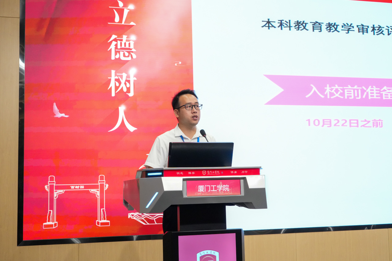 执行院长谢志春老师发表动员讲话,结合评估节点,说明厦门工学院本科教育教学审核评估专家到校时间,审核评估专家的评估方式、统一干部对评估意义与职责的认识、强调了后续班级与学院干部工作重点。