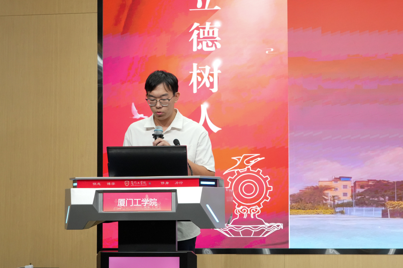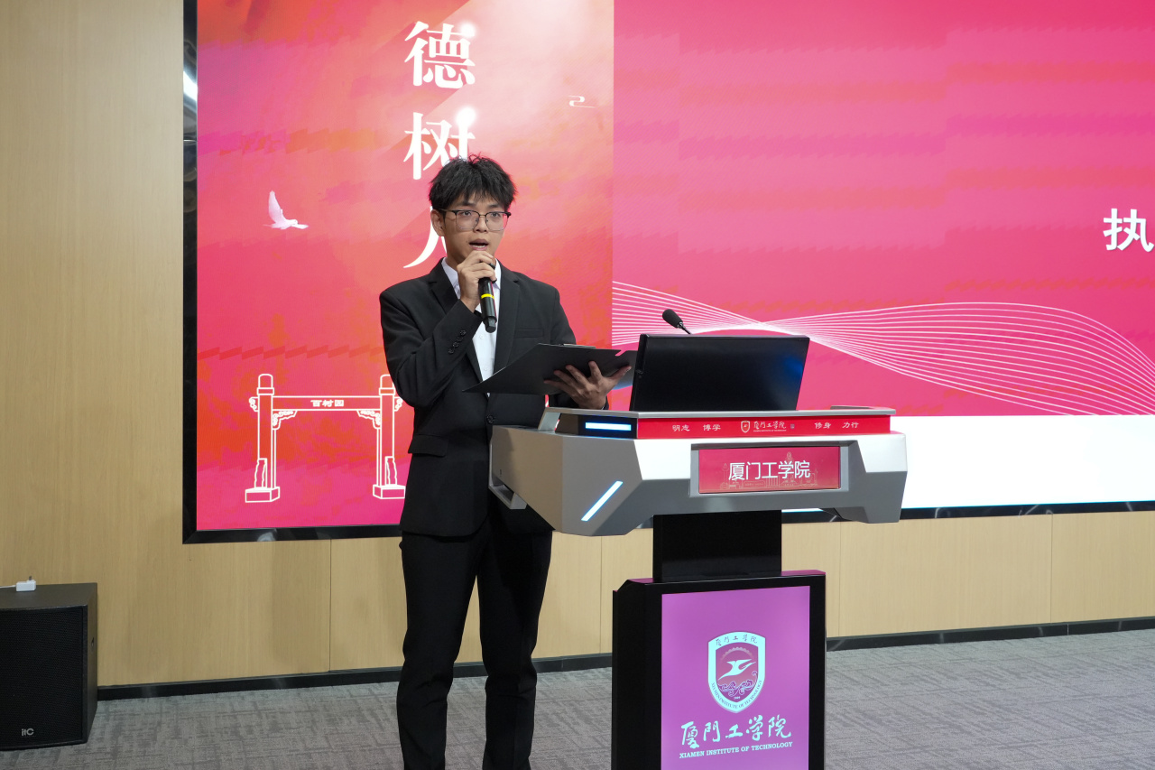 会议设五项议程:主持人介绍参会嘉宾、执行院长谢志春老师动员讲话、学生干部甘熳灵同学与林家栋同学发言、行政副院长郑小聪老师强调重要事项。