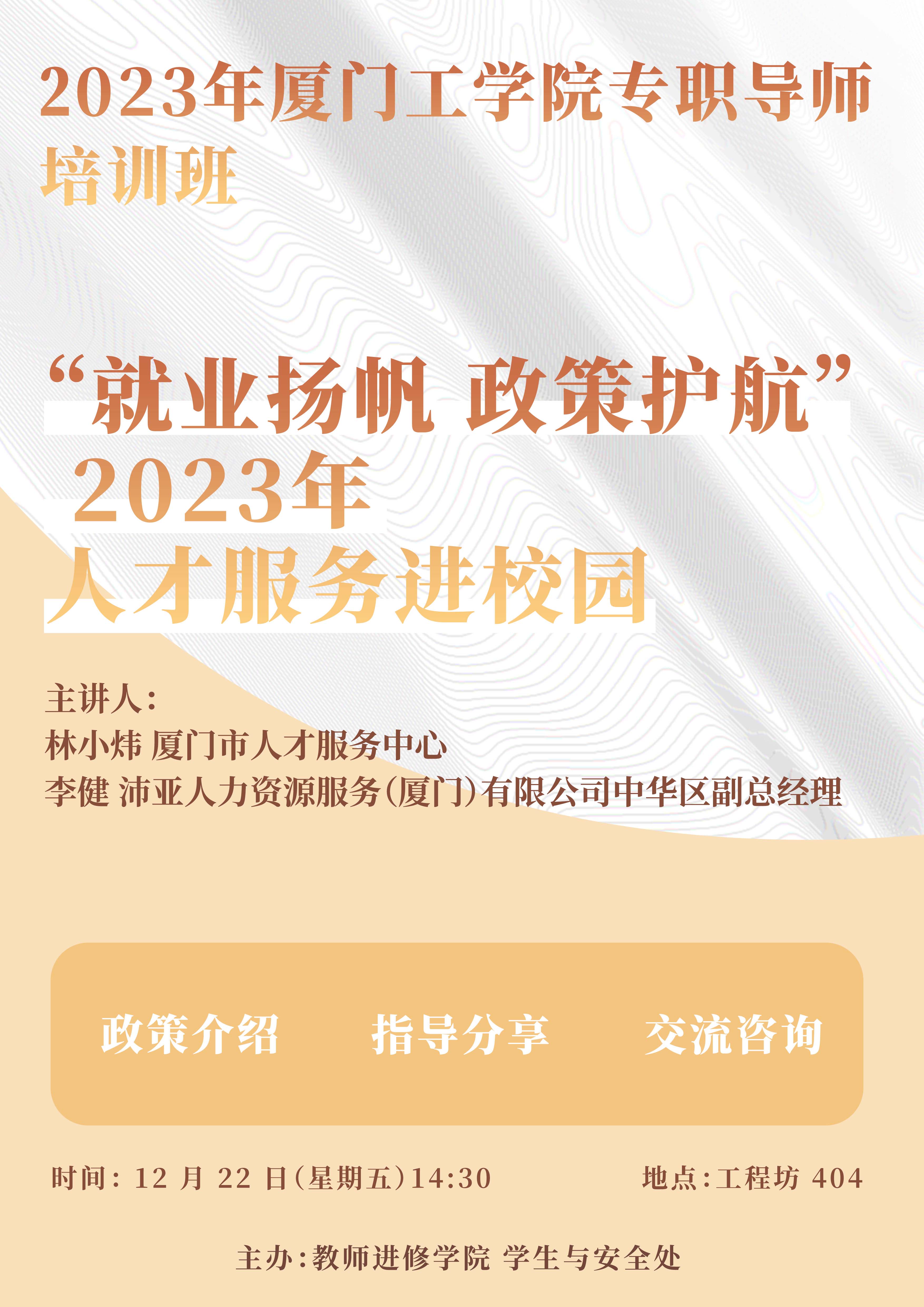 各学院、各部门:兹定于12月22日组织厦门工学院专职导师培训班:“就业扬帆,政策护航”2023年人才服务进校园,现将有关事宜通知如下:一、时间:2023年12月22日 (周五)14:30二、地点:工程坊404三、主题:就业扬帆,政策护航”2023年人才服务进校园四、主讲人:厦门市人才服务中心 林小炜
