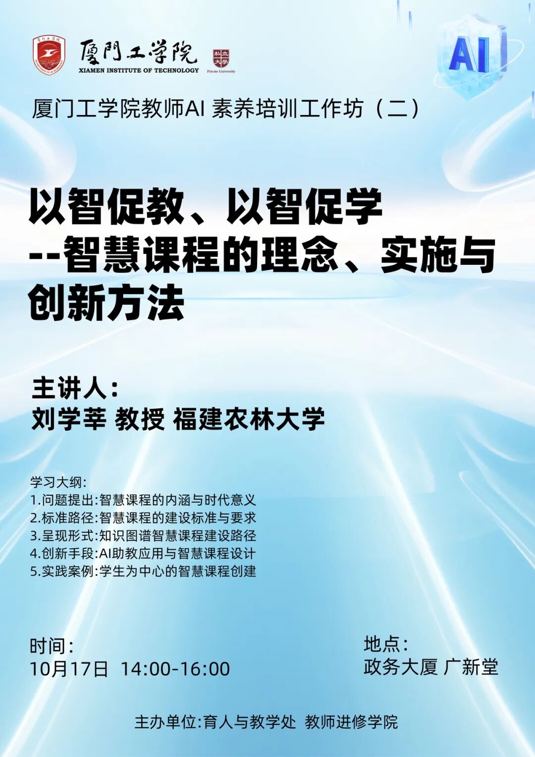 教师进修| 预告 厦门工学院教师AI素养培训工作坊(二)以智促教、以智促学——智慧课程的理念、实施与创新方法