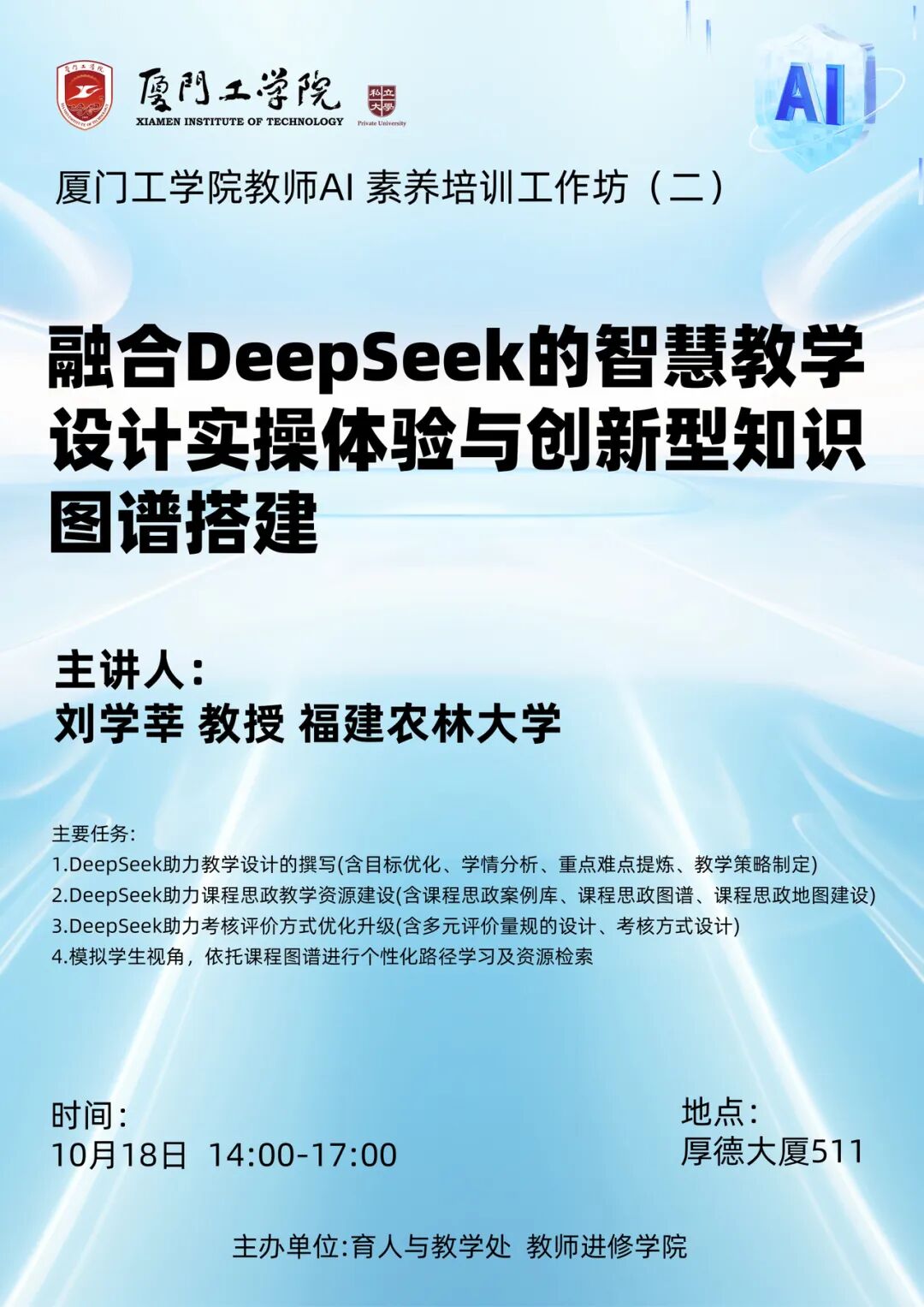教师进修 | 预告 厦门工学院教师AI素养培训工作坊(二):融合DeepSeek的智慧教学设计实操体验与创新型知识图谱搭建