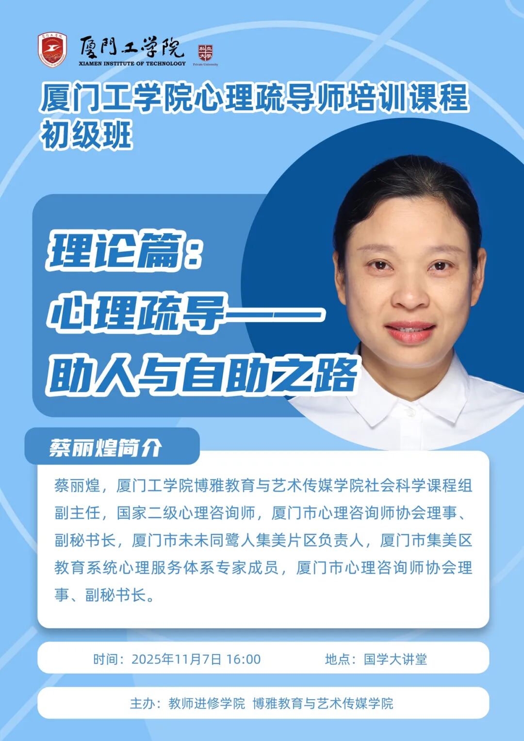 教师进修| 预告 厦门工学院心理疏导师培训课程初级班理论篇 : 心理疏导——助人与自助之路