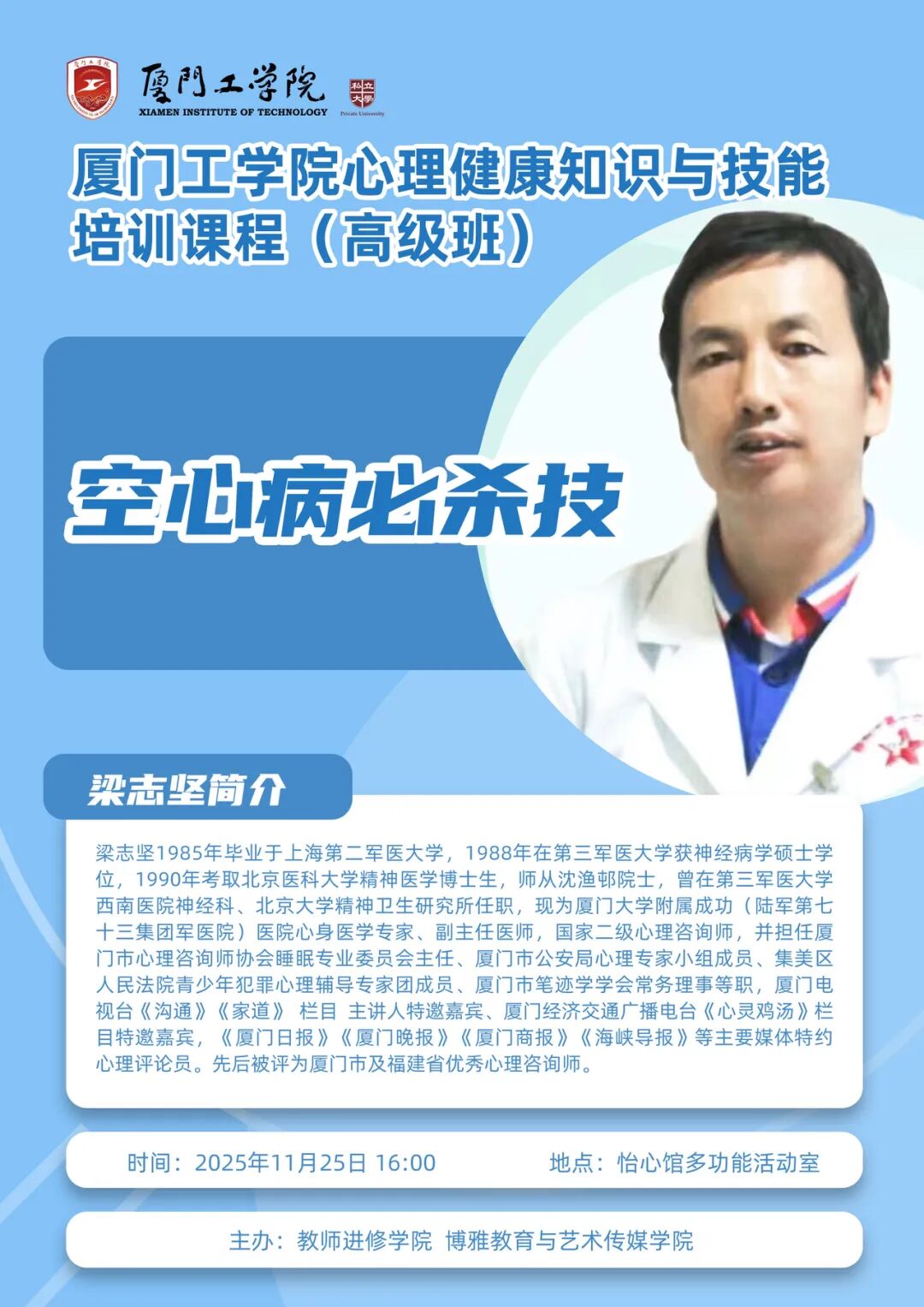 教师进修 | 预告 厦门工学院心理健康知识与技能培训课程(高级班):空心病七杀技