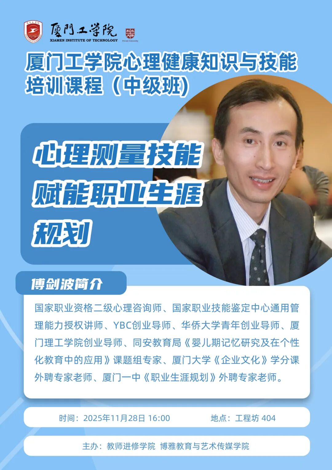 教师进修 | 预告 厦门工学院心理健康知识与技能培训课程(中级班):心理测量技能赋能职业生涯规划