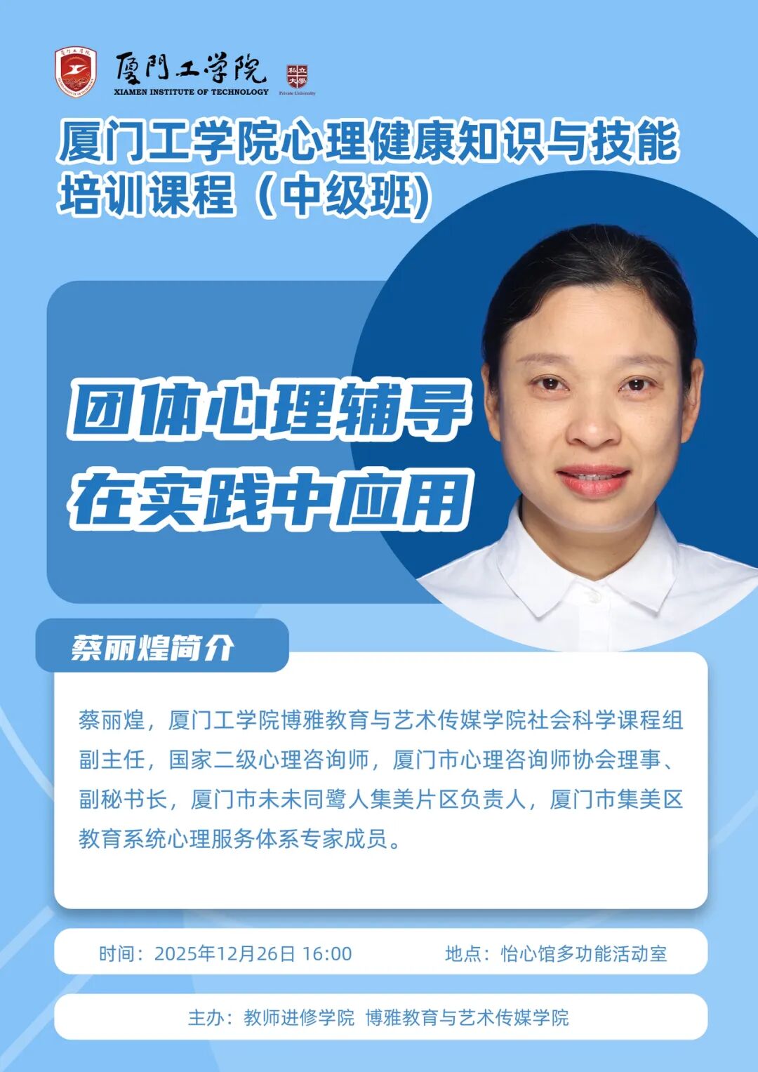 教师进修 | 预告 厦门工学院心理健康知识与技能培训课程(中级班):团体心理辅导在实践中应用