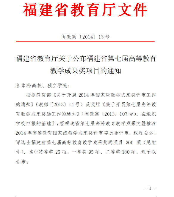 福建省教育厅关于公布福建省第七届高等教育教学成果奖项目的通知