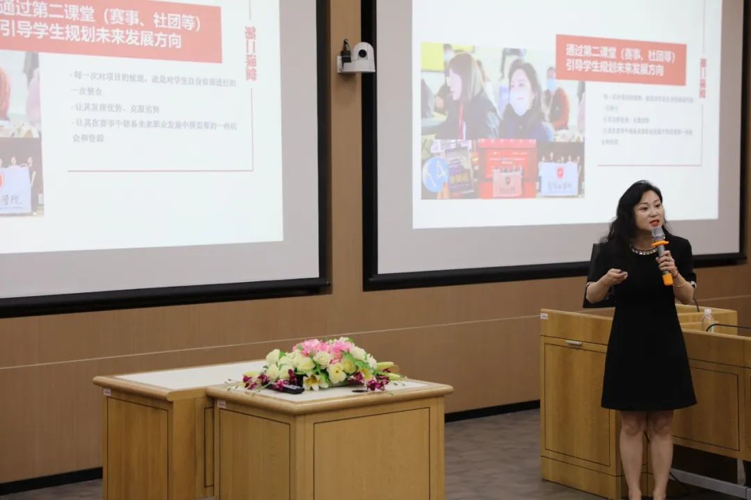 外国语学院的令狐萌萌老师围绕“从课堂教学到就业指导,培养商务英语专业学生的职业素养”的主题,主要分享了如何把学生的职业生涯规划和课程内容相结合,帮助学生找到合适的职业发展道路。