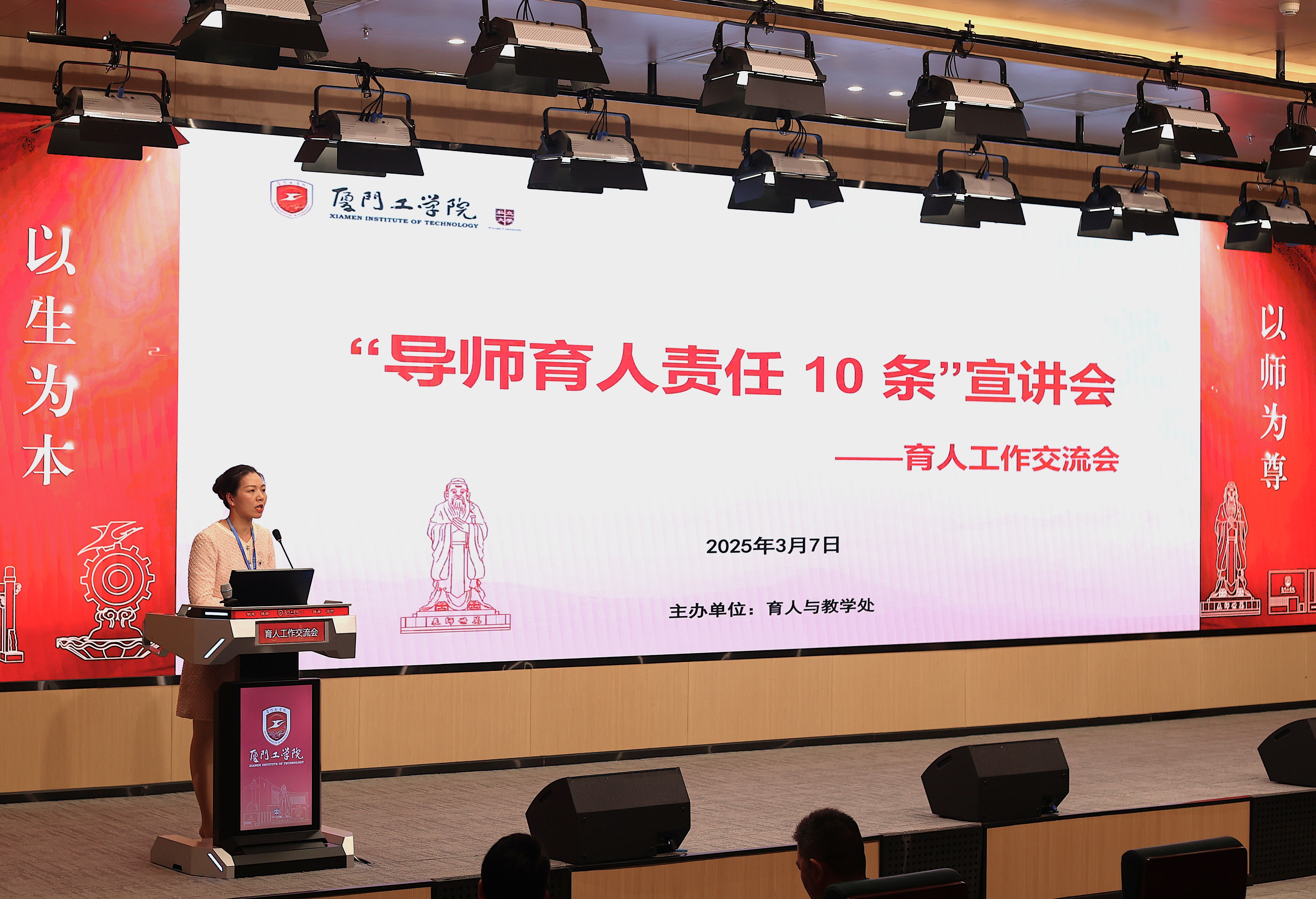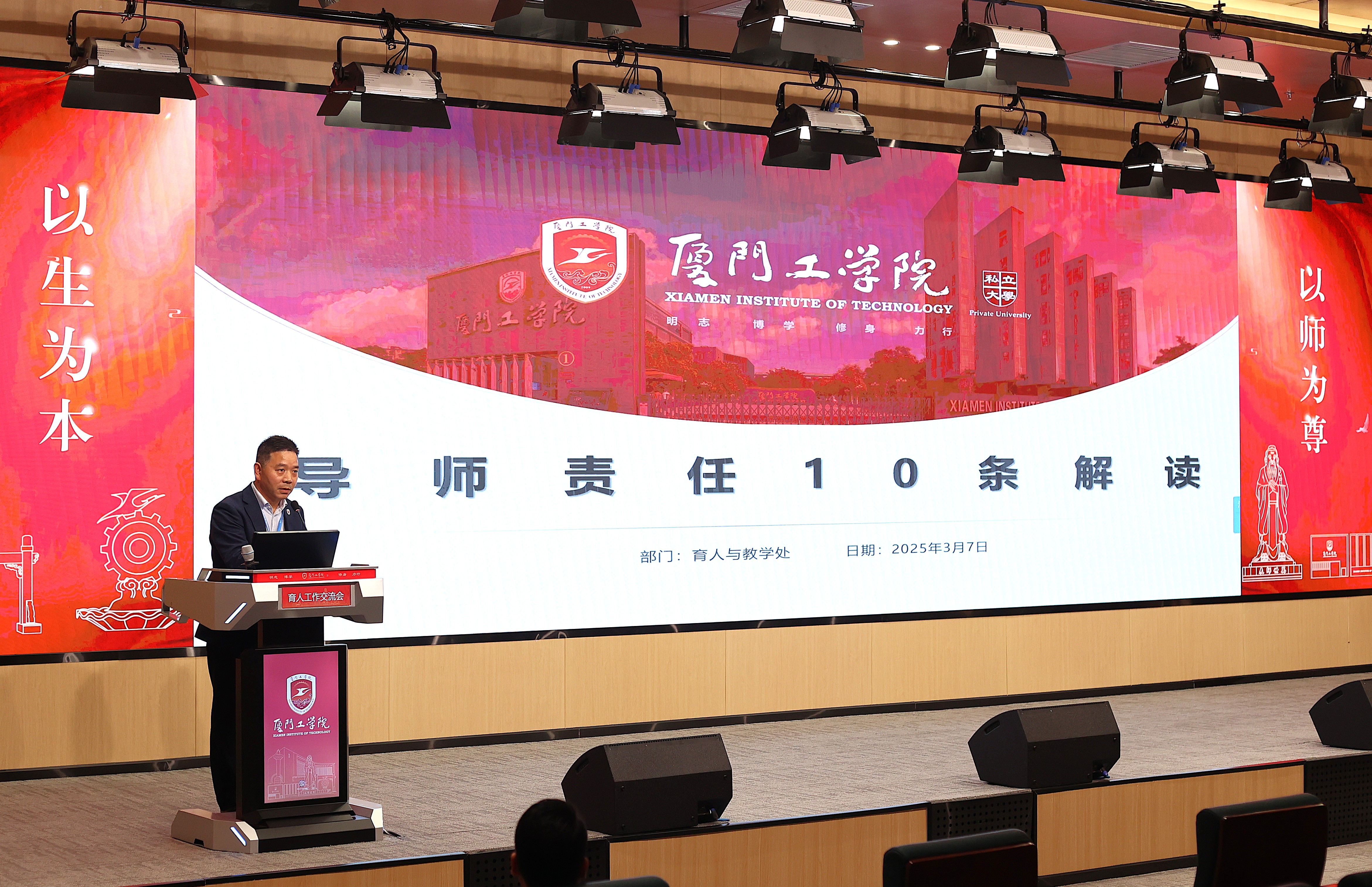 3月7日下午,一场由育人与教学处组织,以“班级导师育人责任十条”为主题的宣讲会在本校立林学术报告厅召开。本次交流会由郭新巧老师主持,邀请育人与教学处白继博处长作为主讲人,各学院执行院长、行政副院长及全体班级导师参加会议。