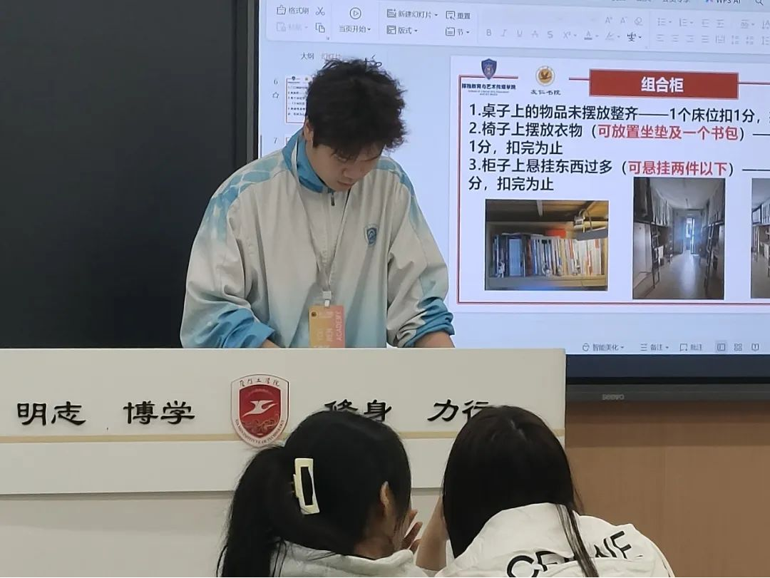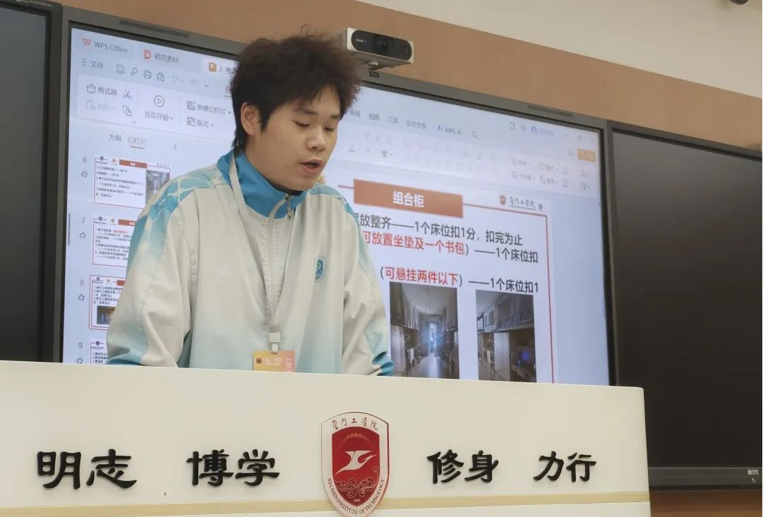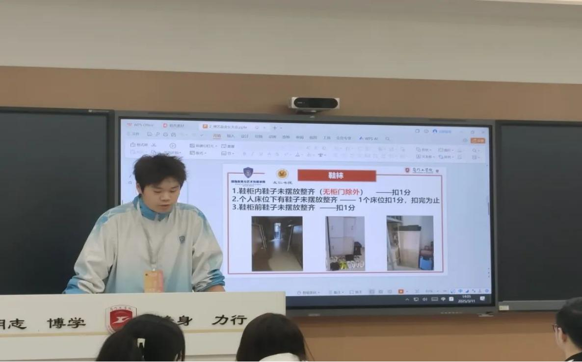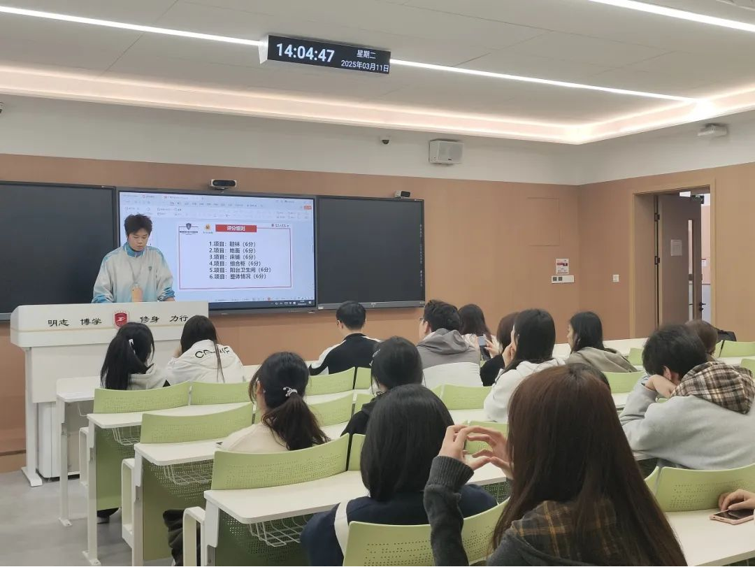 本次大会主要强调宿舍环境检查工作的具体事项以及着重需要关注的地方,如地面是否干净,阳台水池是否有污垢堆积,卫生间是否有明显异味,以及组合柜是否摆放整齐都需要重点关注。不符要求的宿舍,都会按照扣分规则进行扣分处理。