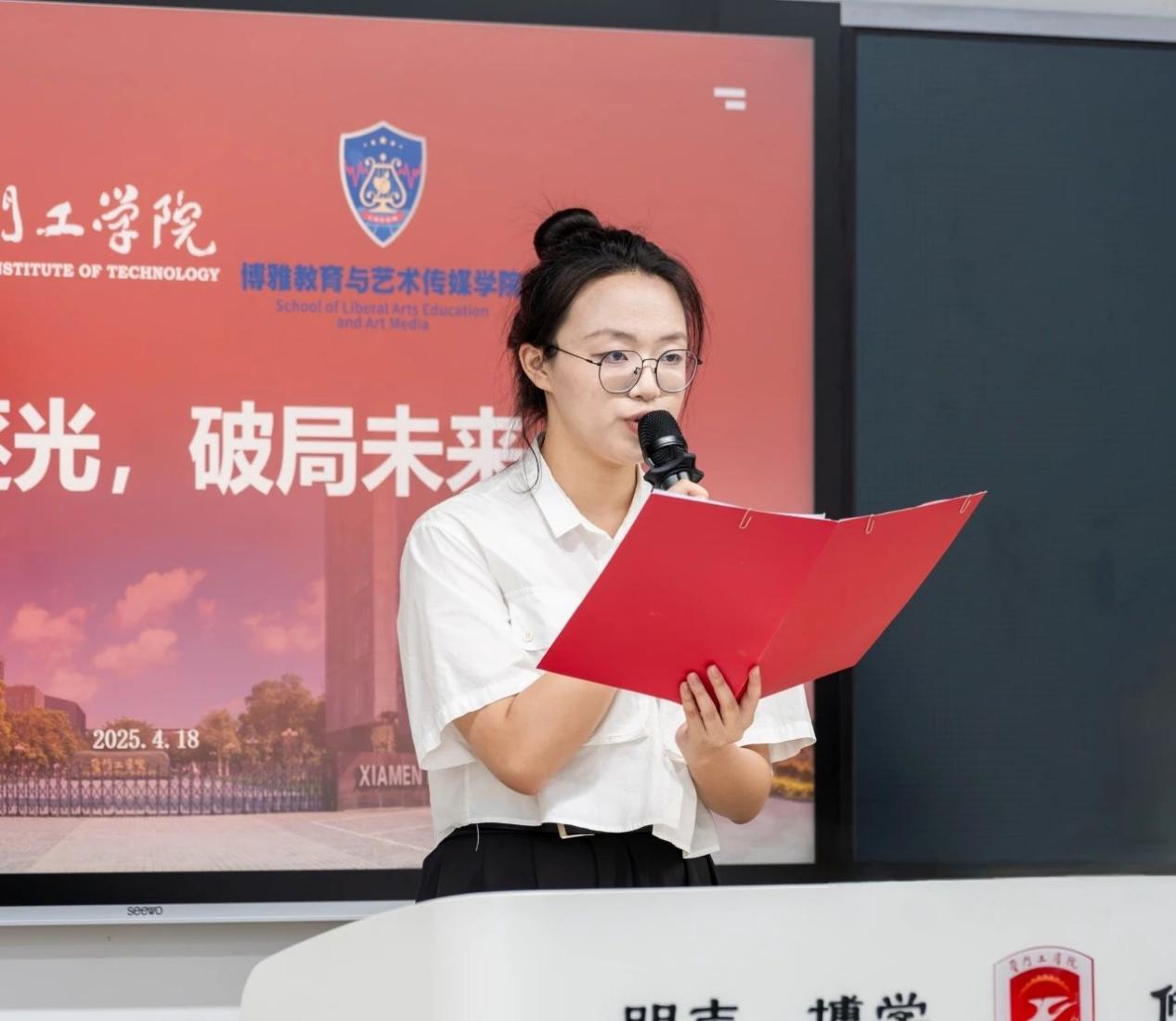 比赛伊始,主持人赵恩宣布比赛规则并介绍了到场的评审嘉宾,包括博雅教育与艺术传媒学院课程教研组主任瞿丽闵老师、专任教师马晗老师以及专职导师李学群老师。