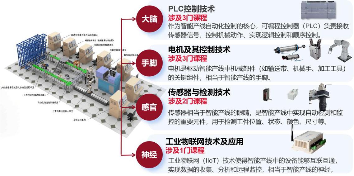 要完成不同智能产线的升级、设计交付,涉及到的工艺流程和对象不同,例如图中所示的柔性智能产线,可以适配不同的产品进行柔性组装,不同的产品,装配组装流程肯定是不同的,但是涉及到的关键技术是共同的,例如作为核心控制(相当于智能产线的大脑)所需的PLC控制技术,用于驱动关键组件的电机及其控制技术(相当于产线的手脚),传感器与检测技术相当于智能产线的感官,可实现加工组件各种状态检测,以及实现设备间数据采集、互通的工业物联网技术(相当于智能产线的神经),我们把它们统称为电气共性技术。