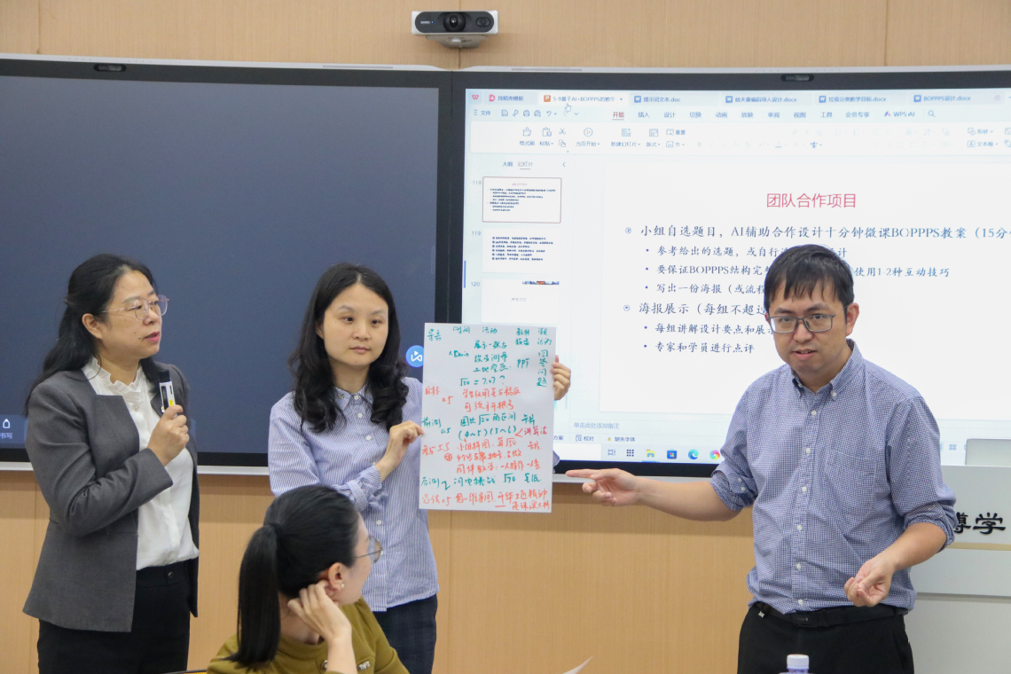 下午的工作坊进入了真正的“实操阶段”。老师们分组合作,围绕各自学科特点,设计出多个具有学生参与感的教学方案,并进行了精彩的模拟授课展示。每组展示后,赵教授都给予了细致点评与建议,其他老师也积极互评交流,现场思维碰撞不断,真正实现了“学中做、做中学”。