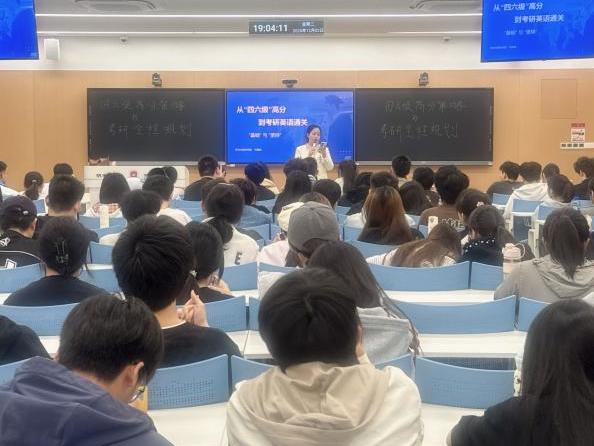 讲座由商务英语教研组组长韩冰老师主持。宋榕榕老师结合丰富案例,深入剖析四六级与考研英语的异同,强调词汇是取得高分的基石,指出“单词为王”的重要性。她通过真题对比,说明词汇量对阅读理解的影响,并针对考研英语的深度理解特点,讲解解题思路。宋老师还为不同年级学生规划备考路径,鼓励大家尽早准备、扎实积累。