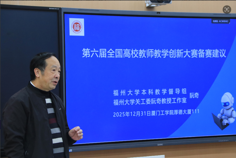 为助力我校教师在第六届高校教师教学创新大赛中准确把握赛事导向、增强参赛实力,学校于2025年12月31日特邀福建省杰出人民教师、福州大学二级教授阮奇开展《第六届全国高校教师教学创新大赛备赛建议》专题讲座。来自各教学单位的30余名参赛教师共同参与,围绕赛事核心要点展开深度研讨学习,为后续备赛工作筑牢基础。