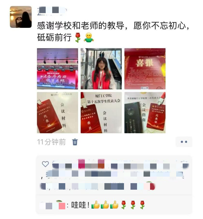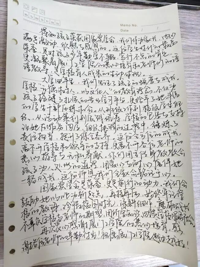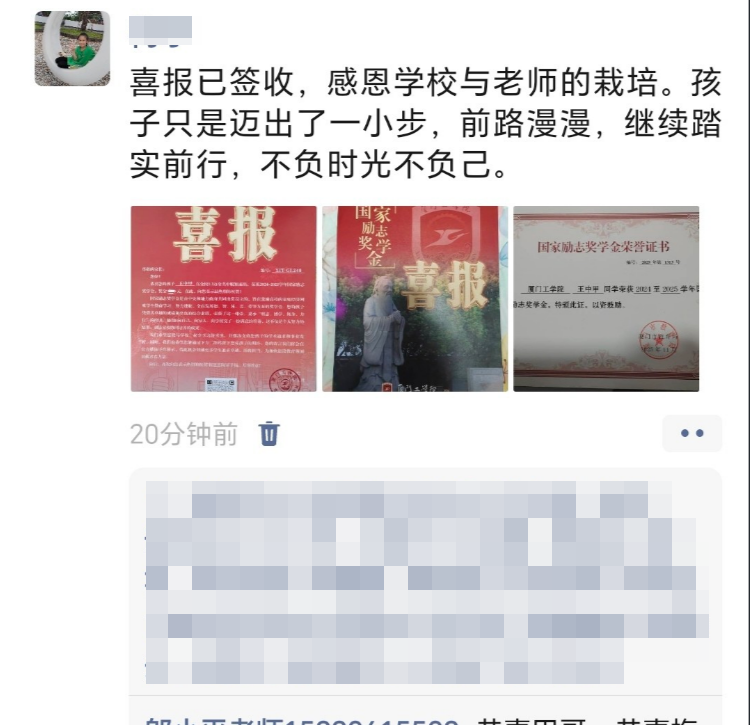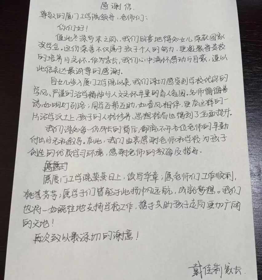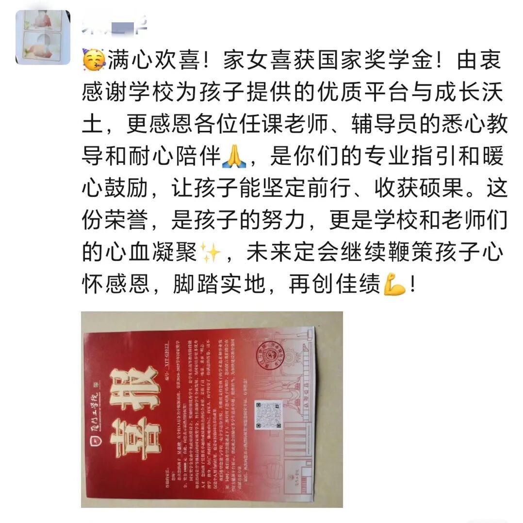 衷心感谢厦门工学院三年来对小女的悉心培育与悉心教导,助她学有所获、不负努力,斩获国家励志奖学金这份荣誉。愿她常怀感恩、笃行不怠,在余下的大学时光里继续脚踏实地、精进学业,不负学校的栽培。