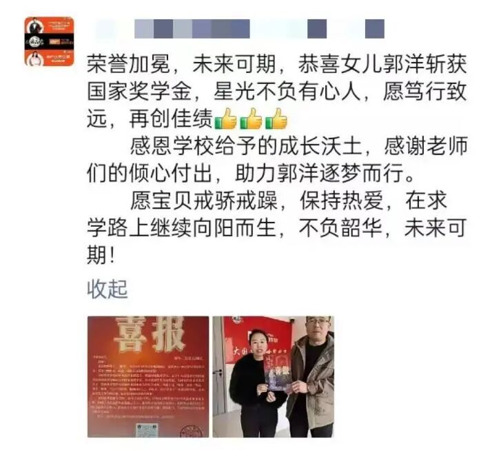 荣誉加冕,未来可期,恭喜女儿郭洋斩获国家奖学金,星光不负有心人,愿笃行致远,再创佳绩!感恩学校给予的成长沃土,感谢老师们的倾心付出,助力郭洋逐梦而行。愿宝贝戒骄戒躁,保持热爱,在求学路上继续向阳而生,不负韶华,未来可期!