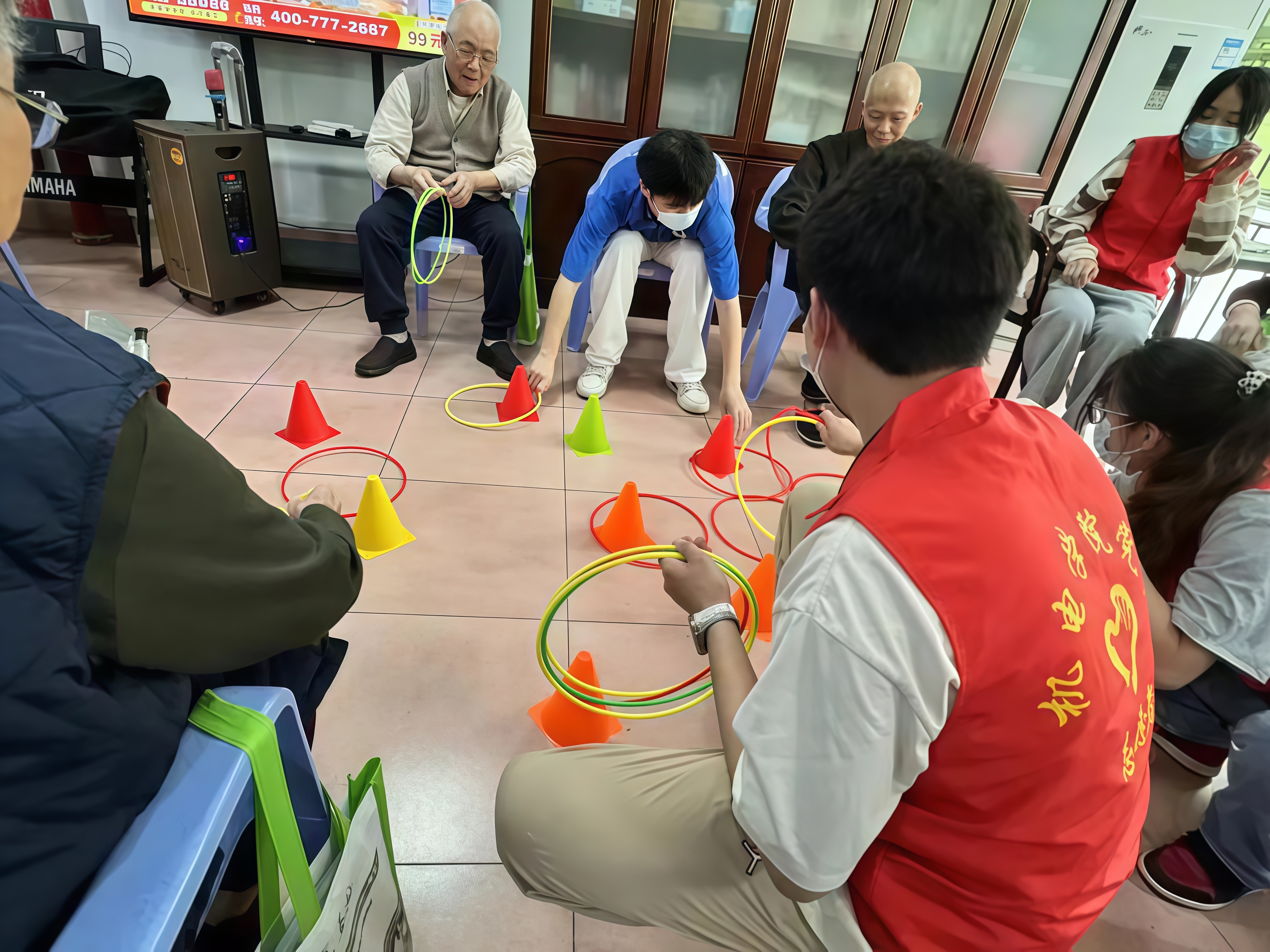 本次活动,我们手把手教长者们套圈,将锥体放在地上,让长者们投出圆圈,并套住地上的锥体。在志愿者们的带领和鼓励下,长者们一次又一次的投出圆圈,套中锥体。每当套中时,我们都能在长者们的脸上看到笑容,听到他们的笑声。