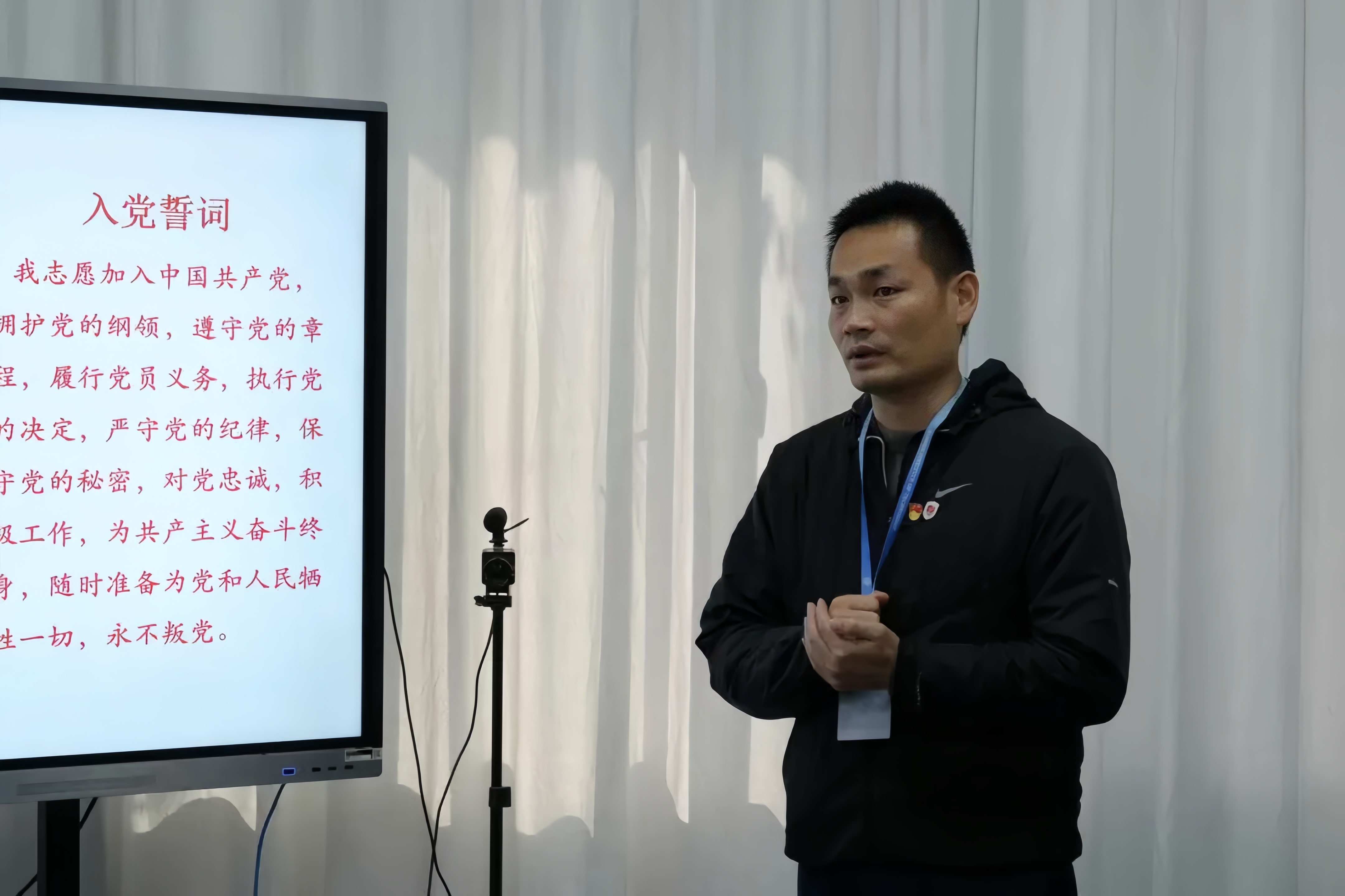 随后,庄严的入党宣誓仪式正式开始。由林圣彤老师作为领誓人,带领新发展党员面向党旗,举起右拳,庄严宣誓。宣誓声整齐而洪亮,回荡在会议室的每一个角落,彰显着新党员们对党的无限忠诚和为共产主义事业奋斗的坚定决心。
