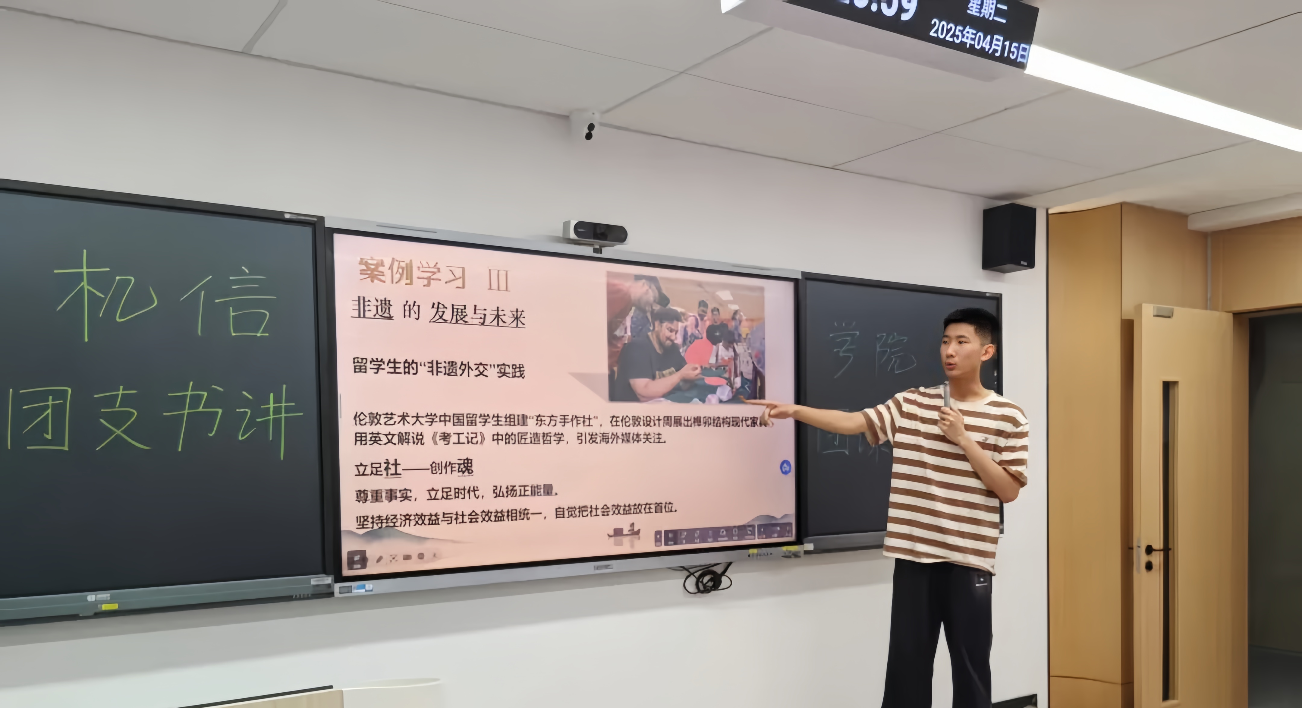 24智工3班团支书陈钰涛在分享中指出,文旅部公布第六批国家级非遗传承人名单,为非遗传承注入新活力。在传承非遗的过程中,存在着传统与现代文化冲突、创新及发展等矛盾。不过,“00 后非遗主播”、景德镇大学生、留学生等群体积极实践,带来诸多成功范例。青年应正确看待技术、创新,平衡热爱与专业,为非遗传承贡献力量,让古老非遗在新时代绽放光彩。