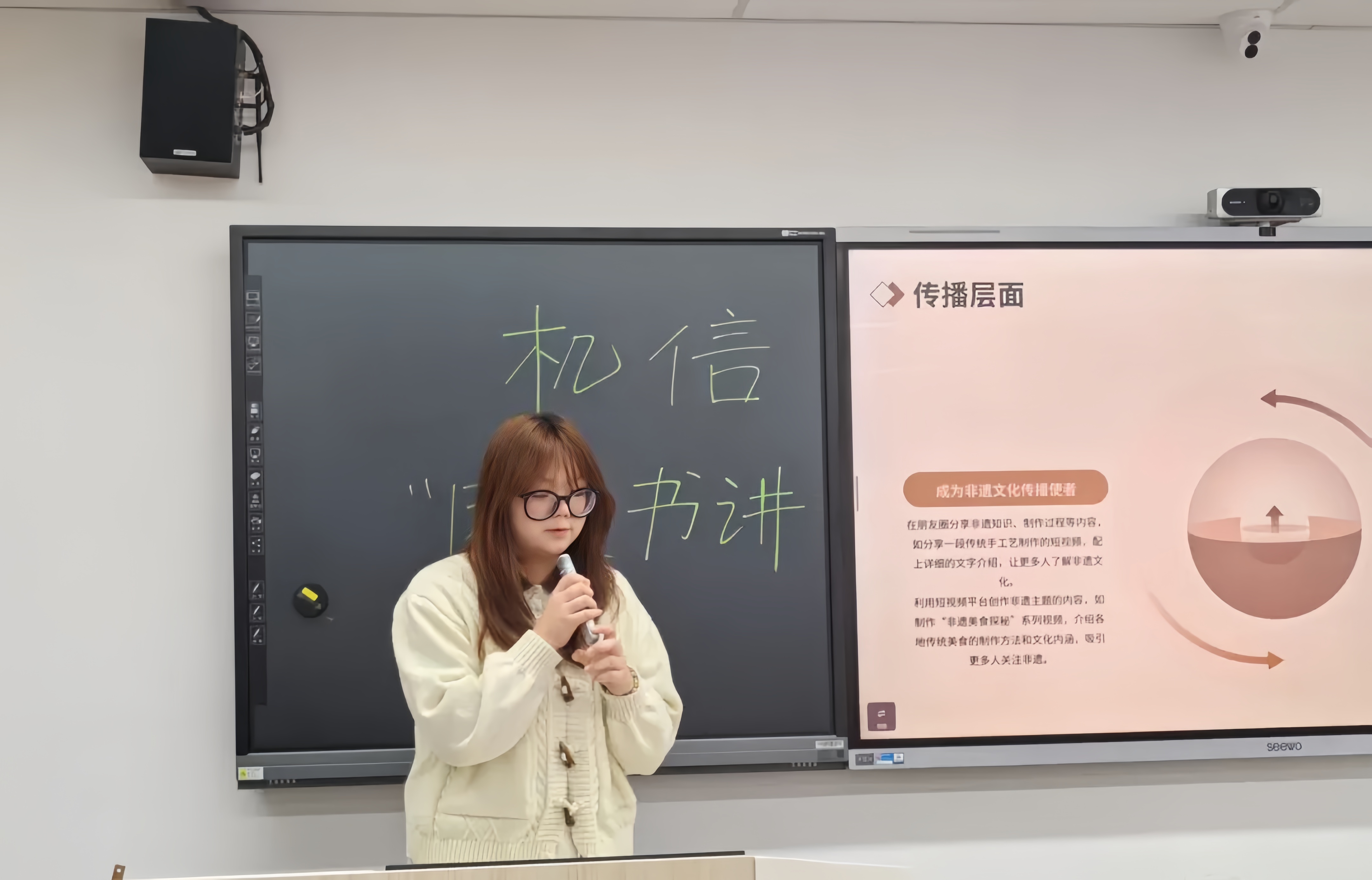 23电子3班团支书谢莞莹在分享中提到,在文化的长河中,非遗文化是一颗璀璨明珠,非遗凝聚着中华民族的智慧,承载着悠久历史,以独特的活态传承延续至今。如今,非遗在现代社会不断创新,与数字技术结合,让更多人领略其魅力。国家级非遗代表性传承人功不可没,他们带动社会传承非遗。非遗还与民族精神紧密相连,彰显着民族风貌。让我们一起守护非遗,让传统文化绽放新光彩!
