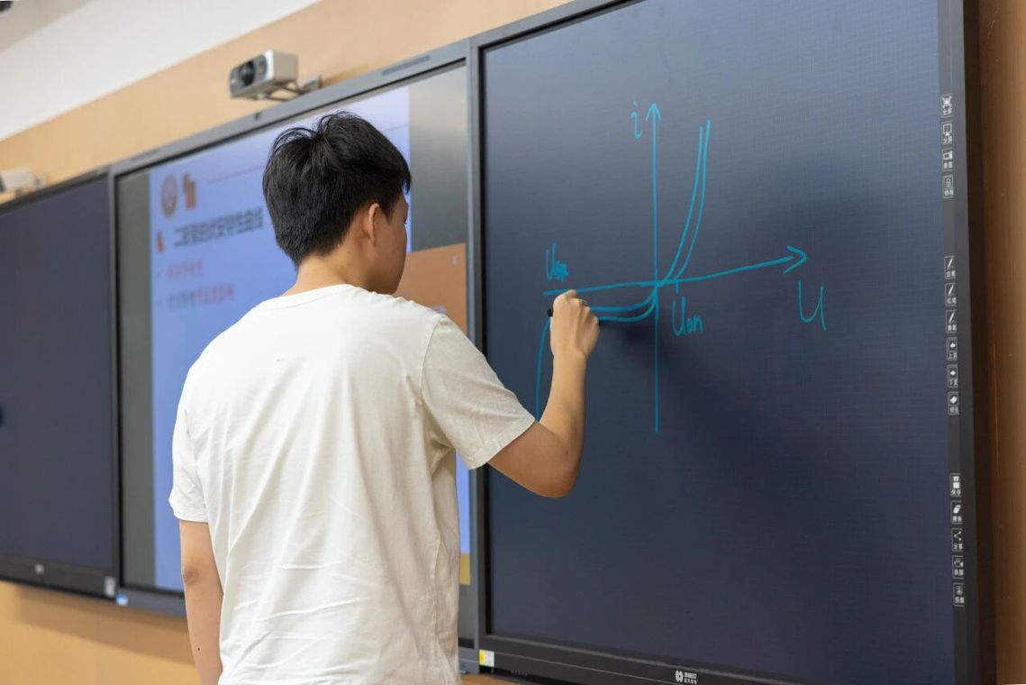 “温度升高时,二极管伏安特性曲线会怎么变化?我们请一位同学上黑板画一下。”在覃杰莉老师的模拟电工技术基础课堂上,频频出现的互动问答引人瞩目。当知识点密度高、节奏快的工科课堂,遇上容易困倦的“早八”节点,如何让学生保持专注力和学习兴趣?充分调和趣味性与知识浓度的互动式课堂就是覃杰莉老师的答案。