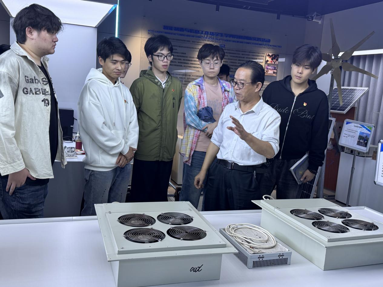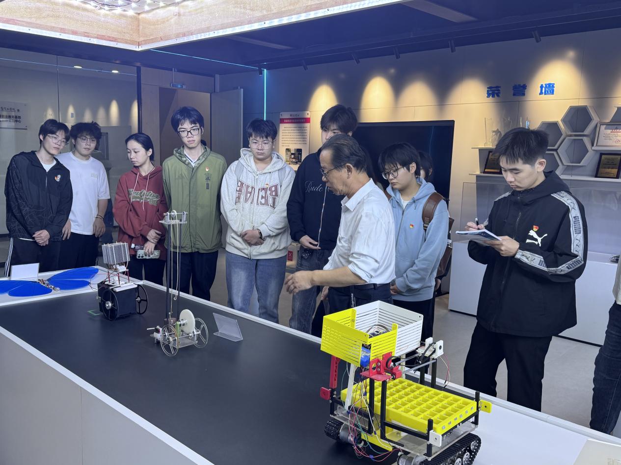 活动首站聚焦工程坊学生作品展室,工程坊职工党支部书记唐晓明老师带着学生党员逐一参观。展厅内,智能垃圾分类设备、智能农业种植一体机、EPS快速成型机、数控雕刻机等一件件凝聚着智慧与汗水的展品整齐陈列。走到每件展品前,唐晓明老师都会放慢脚步,结合展品的技术特点展开细致讲解,学生党员们听得格外专注,不时驻足观察展品的结构设计,认真记录技术要点。大家不仅从标注信息和老师的讲解中,读懂了每项成果的 “含金量”—— 无论是贴近民生的智能设备,还是助力实践创作的加工器械,都彰显着专业知识与实际需求的深度融合;真切感受到了团队协作的力量、精益求精的态度,以及 “敢闯敢试、不畏艰难” 的科创精神。