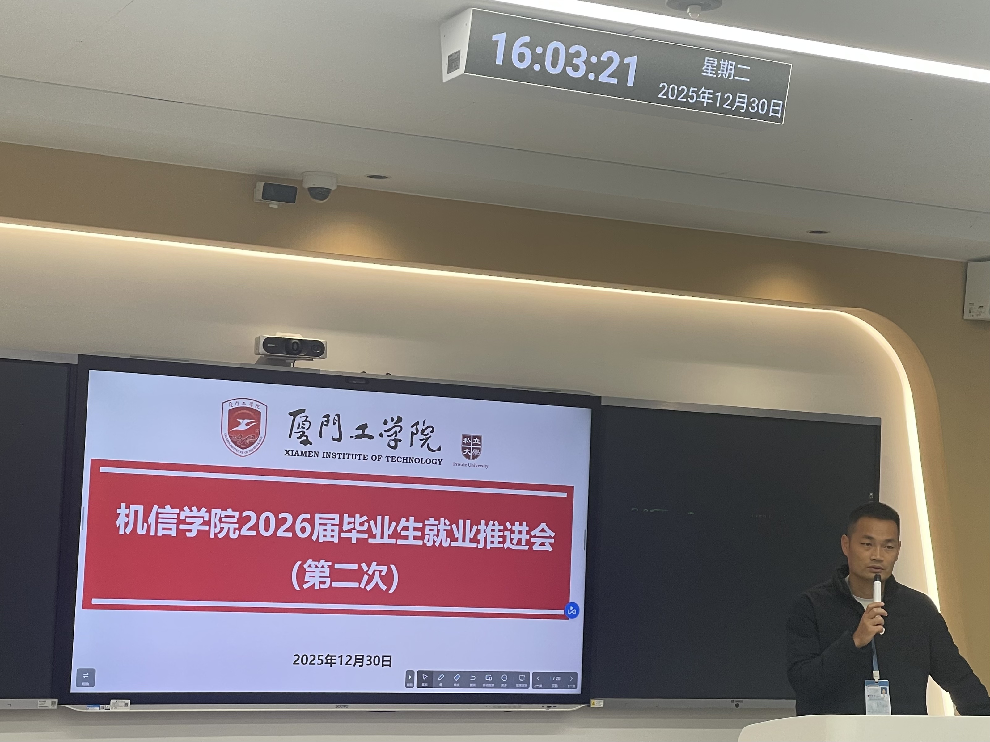 为扎实推进2026届毕业生就业工作,精准把握就业动态,系统部署下一阶段任务,2025年12月30日周二下午16:00机械电气与信息工程学院在厦门工学院明德大厦206召开2026届毕业生第二次就业推进会。学院领导、各专业负责人、毕业班班级导师、辅导员等相关老师参加会议,会议由机信学院行政副院长林圣彤主持。