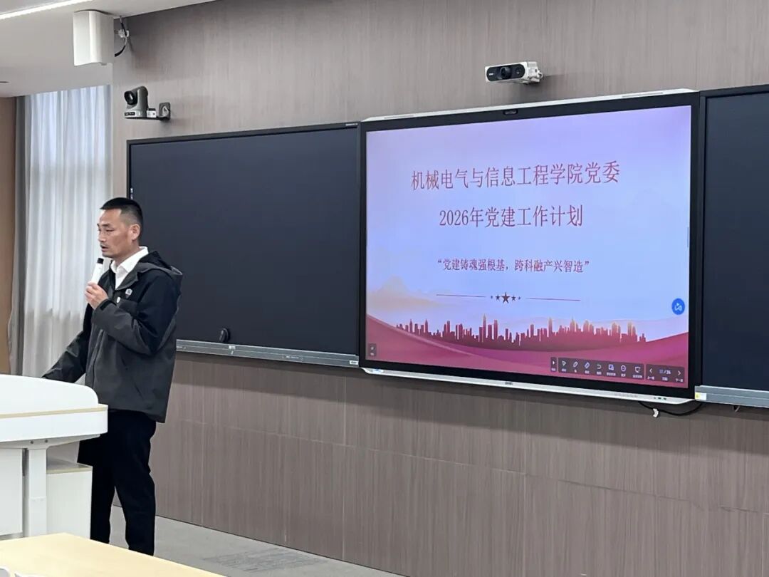 最后,机械电气与信息工程学院党委副书记林圣彤阐述了学院党委2026年党建工作主线,围绕“党建铸魂强根基,跨科融产兴智造”,提出多项具体举措:深化党建与业务双融机制,设立功能型党小组;打造融媒体党课品牌,推动AI赋能智慧党建;拓展校企党组织共建,发挥学生党员先锋作用;搭建师生科研协作平台,助力学科整合与品牌提升。