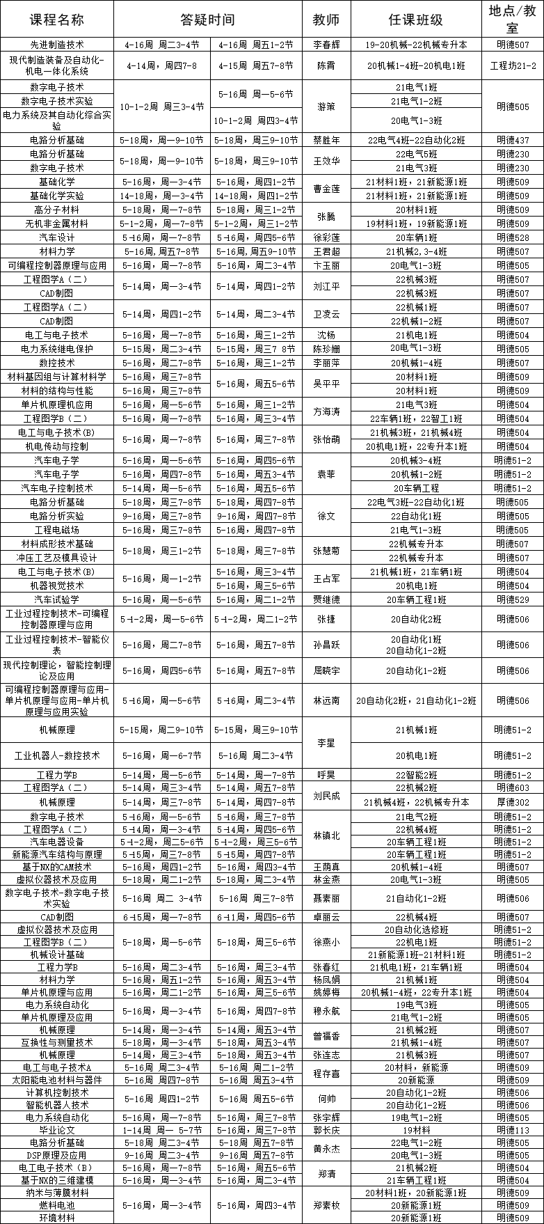 机电学院2022-2023学年第二学期课程答疑时间安排表
