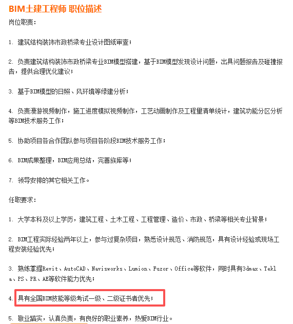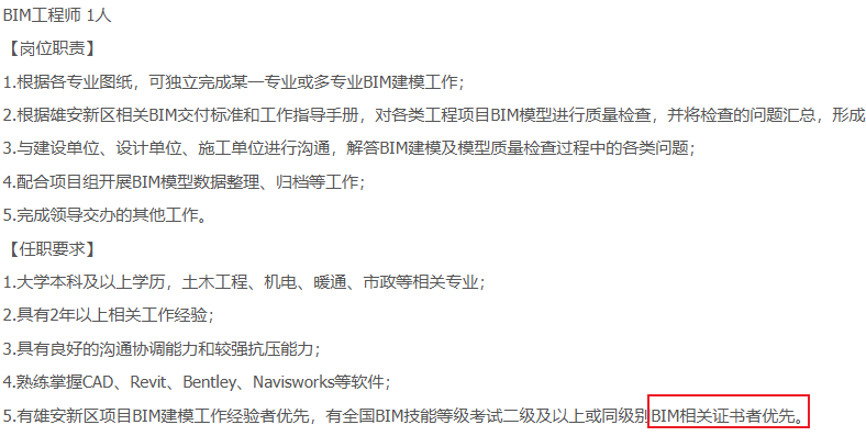 ▪ 某国有企业勘测设计研究院BIM土建工程师岗位要求:“持有BIM证书者优先录取”