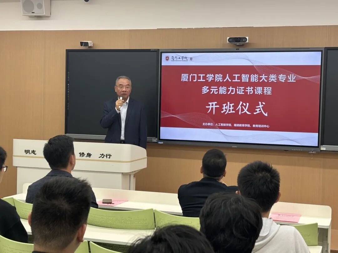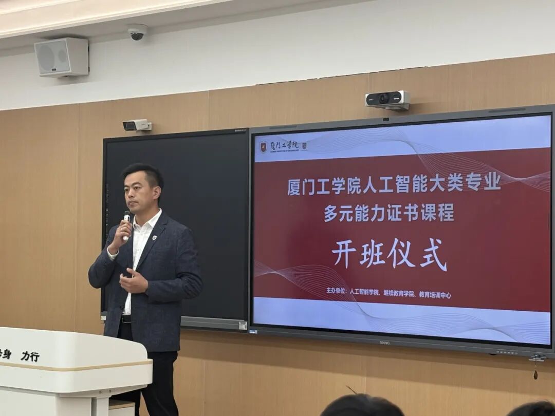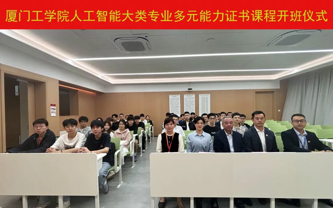 为深入推进“课证融通”改革,强化学生多元能力培养体系建设,12月10日中午,厦门工学院人工智能大类专业多元能力证书课程在厚德207室举行。人工智能学院、继续教育学院及教育培训中心相关负责人、教师代表与参训学生共同参加了仪式。