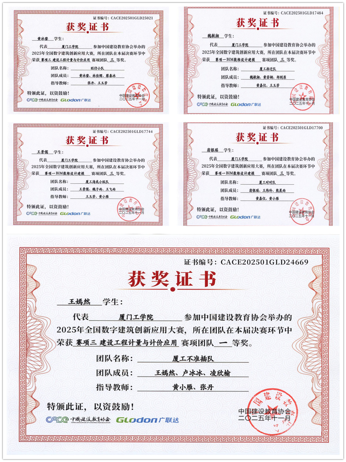 本次大赛由中国建设教育协会主办,是数字建筑领域极具权威性的全国性赛事,旨在搭建数字建筑技术交流与人才展示平台,推动行业创新发展。本次大赛分为初赛和总决赛,赛事以软件实操为核心形式,重点考察选手数字建筑建模、专业软件操作等关键能力,经过初赛选拔 5 支实力突出的队伍脱颖而出,代表学校出征全国总决赛。全国总决赛中,厦门工学院参赛团队展现了扎实的专业功底与高效的团队协作能力,其中,“厦工不准插队” 团队凭借精准的计量分析与出色的计价方案设计,荣获建设工程计量与计价应用赛项团队一等奖。