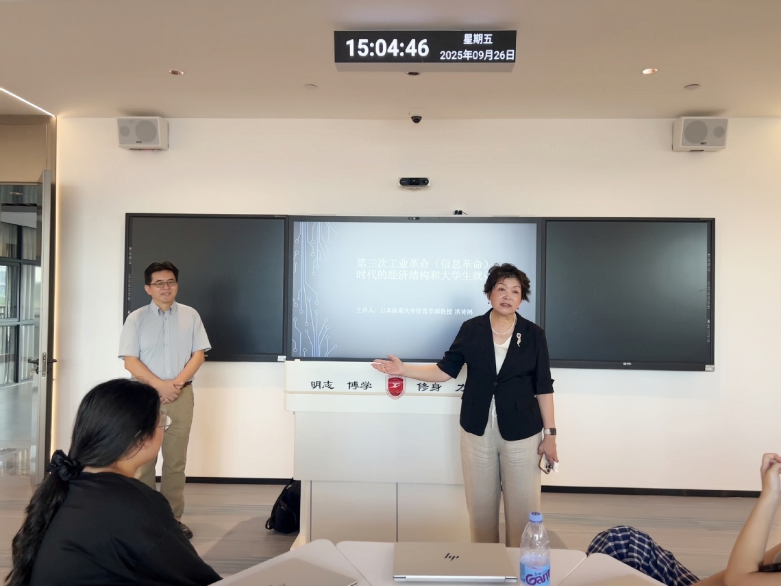 2025年9月26日下午,厦门工学院第70期缘融论坛在怀德403B跨境电商产业学院顺利举办。本次论坛以“第三次工业革命(信息革命)时代的经济结构和大学生就业”为主题,由外国语学院外语类课程教研组主任陈端端教授主持,日本阪南大学经营学部及企业信息学研究生院院长洪诗鸿教授担任主讲嘉宾,跨境电商产业学院师生及全校各专业近80位同学到场聆听。