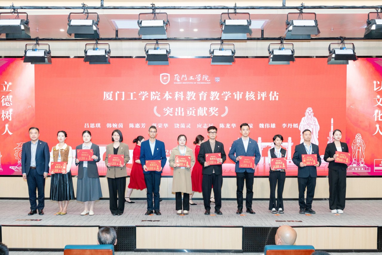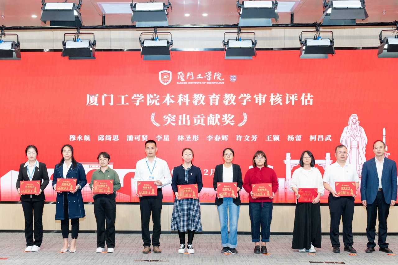 苏涵校长,校党委朱瑞元书记,李雄虎副董事长、执行校长,李咏梅副校长,李文副校长颁发“厦门工学院本科教育教学审核评估突出贡献奖”。
