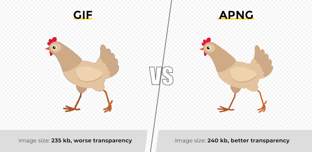 再结合优异的压缩算法, apng 在文件大小和 gif 相似的情况下,图片质量要更高,而且即使不加载整个动图也能预览第一张。