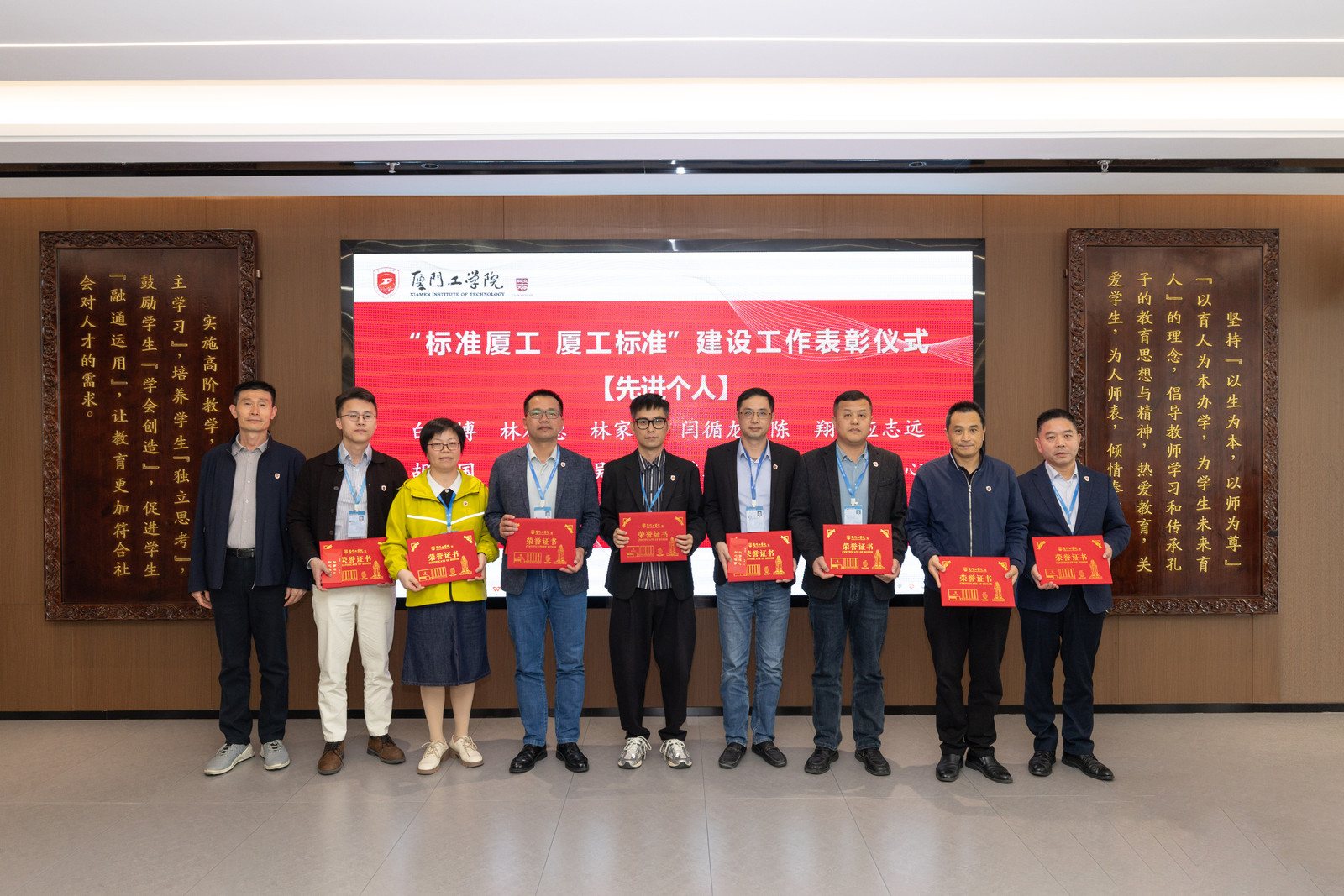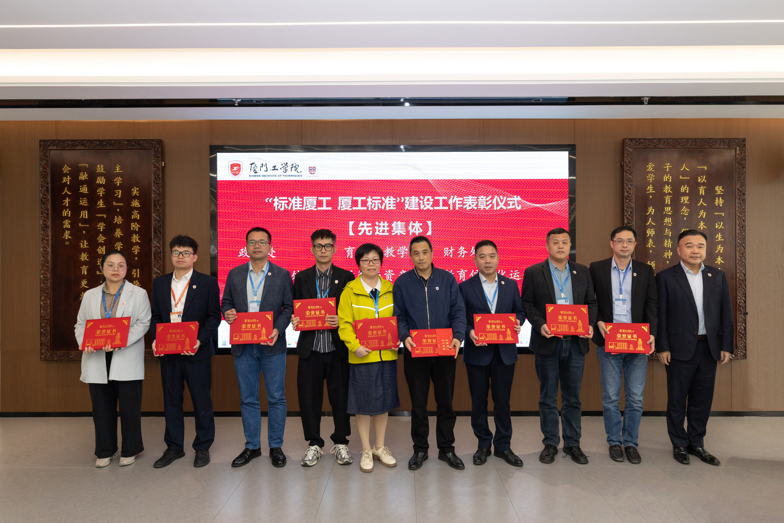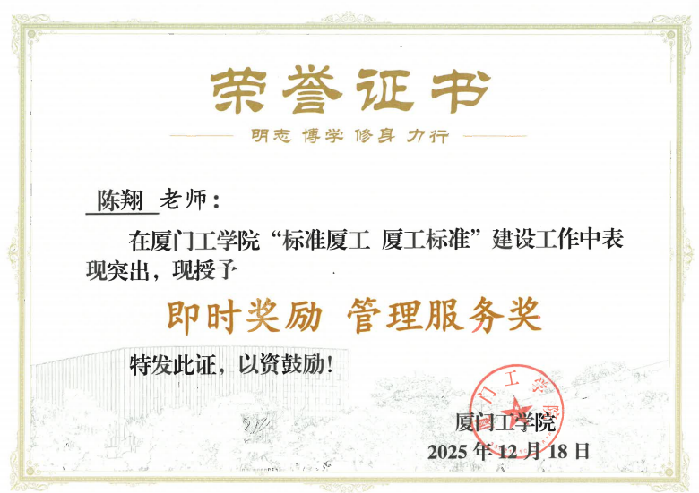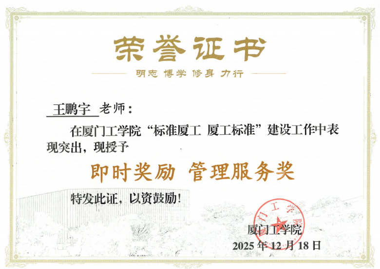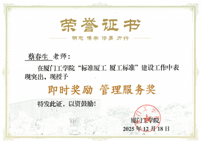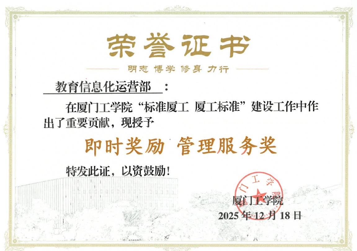 2025年12月18日,在学校“标准厦工 厦工标准”建设工作阶段总结下一阶段工作部署会上,教育信息化运营部被授予“先进集体”称号,陈翔、王鹏宇、蔡春生三位同志获评“先进个人”。会议于政务大厦广新堂举行,校领导对获奖集体与个人在推动标准化与信息化深度融合中的突出贡献予以充分肯定。