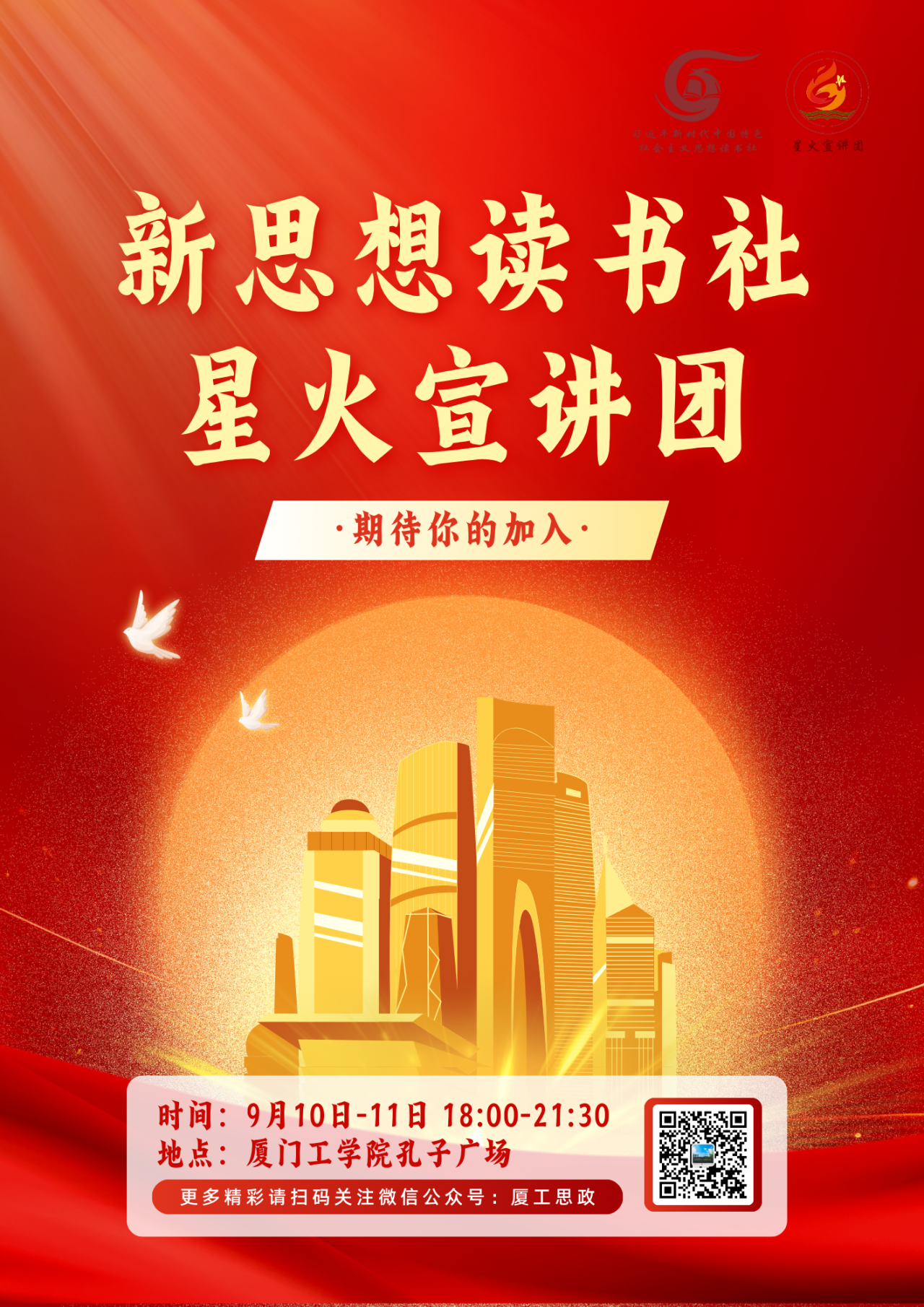 新思想读书社成立于2018年,是厦门工学院聚焦青年思想引领的理论学习型社团。2018年10月入选为福建省高校第二批马克思主义理论读书社,读书社依托学校思政部专业教师资源,以“学思践悟新思想,培根铸魂育新人”为宗旨,搭建“学+思+研+创”一体化理论学习平台。