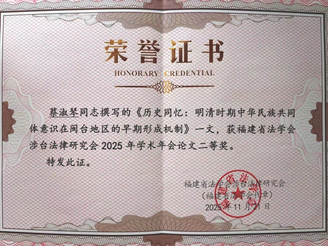 年会围绕“深化两岸融合发展法治保障 推进祖国统一制度体系建设”的核心议题展开深入探讨,我校蔡淑琴老师应邀作主题发言,以《历史同忆:明清时期中华民族共同体意识在闽台地区的早期形成机制》为题,分享了其近期的研究成果。该论文获福建省法学会涉台法律研究会2025年学术年会论文二等奖。