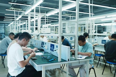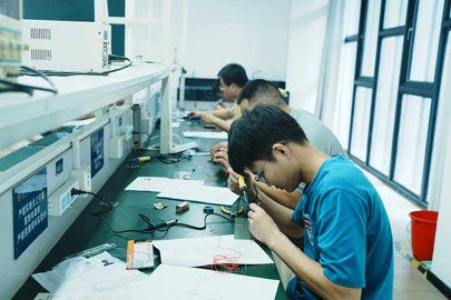在配电柜低沉的电流声中,考生们躬身专注,手持电烙铁细致操作——385℃的烙铁头轻触覆铜板,焊锡丝瞬间熔化,伴随“滋”的一声轻响与一缕白烟,精准焊接在毫秒间完成。