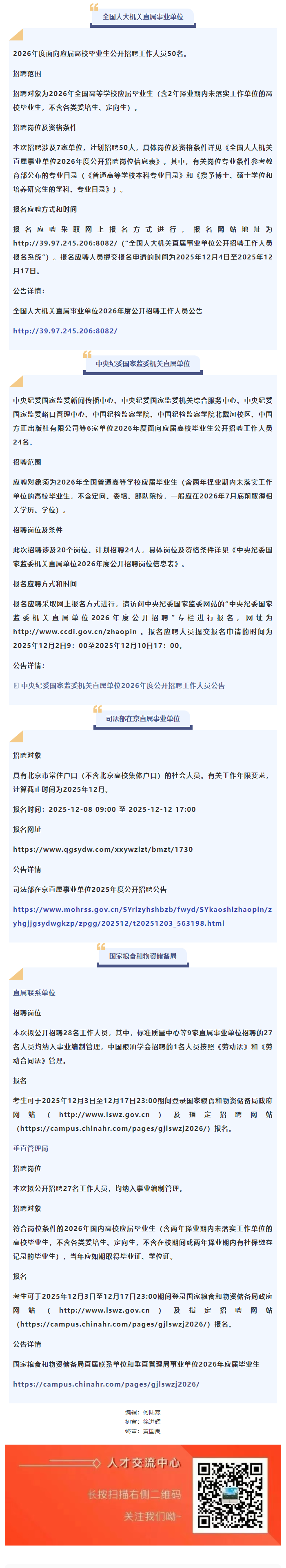 岗位推荐 | 公告!中央和国家机关所属事业单位招聘汇总!