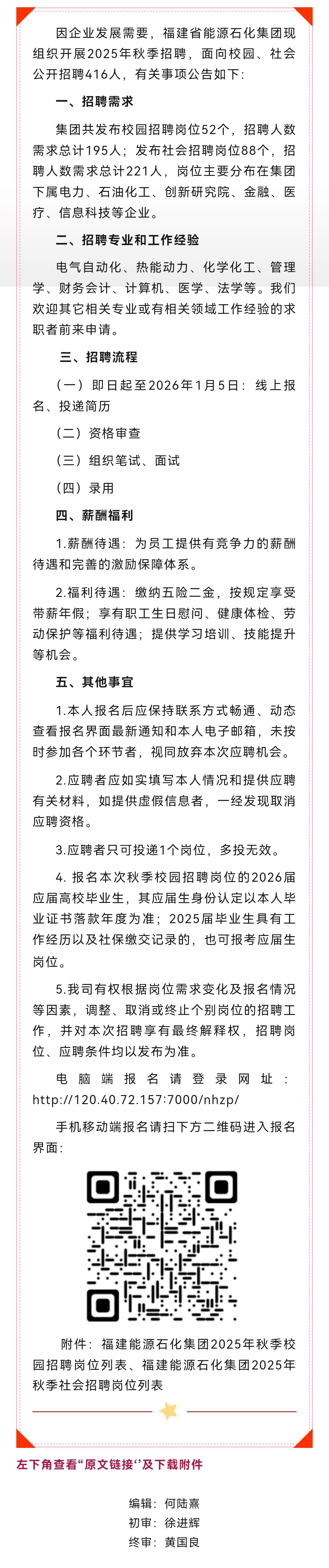 岗位推荐 | 416人!福建省能源石化集团2025年秋季招聘启事