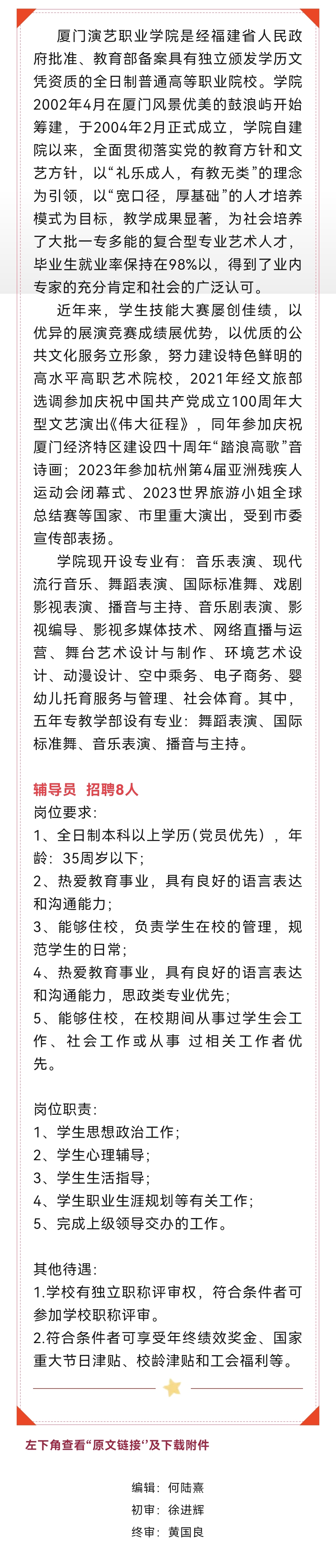 岗位推荐 | 辅导员8名!厦门演艺职业学院招聘