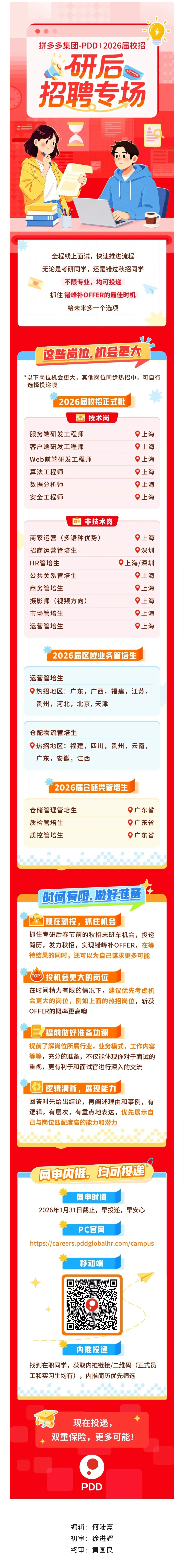 岗位推荐 | 拼多多集团-PDD | 研后招聘专场,这些岗位机会更大,速投!