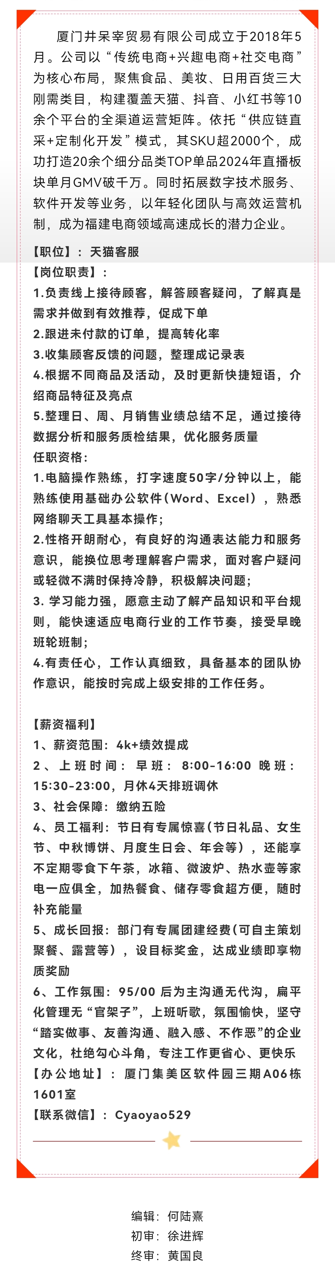 岗位推荐 | 厦门井呆宰贸易有限公司招聘中!