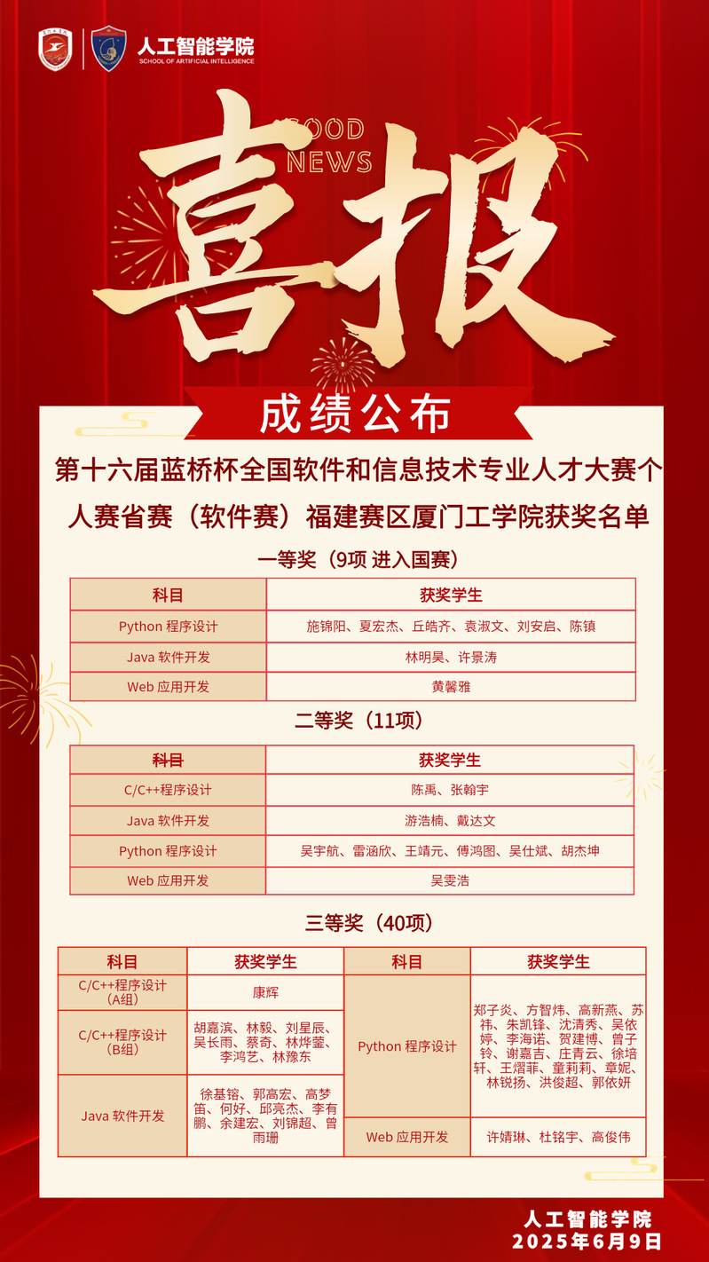 今年我校有60位同学获得省级以上奖项,比去年增长58%,其中,有9名同学获得省级一等奖,获得国赛资格,比去年增长80%。在本届大赛中,2024级的同学们展示了良好的风貌,获得了历史上最好的成绩,同时预祝9名省级一等奖的选手在国赛中取得优异的成绩!