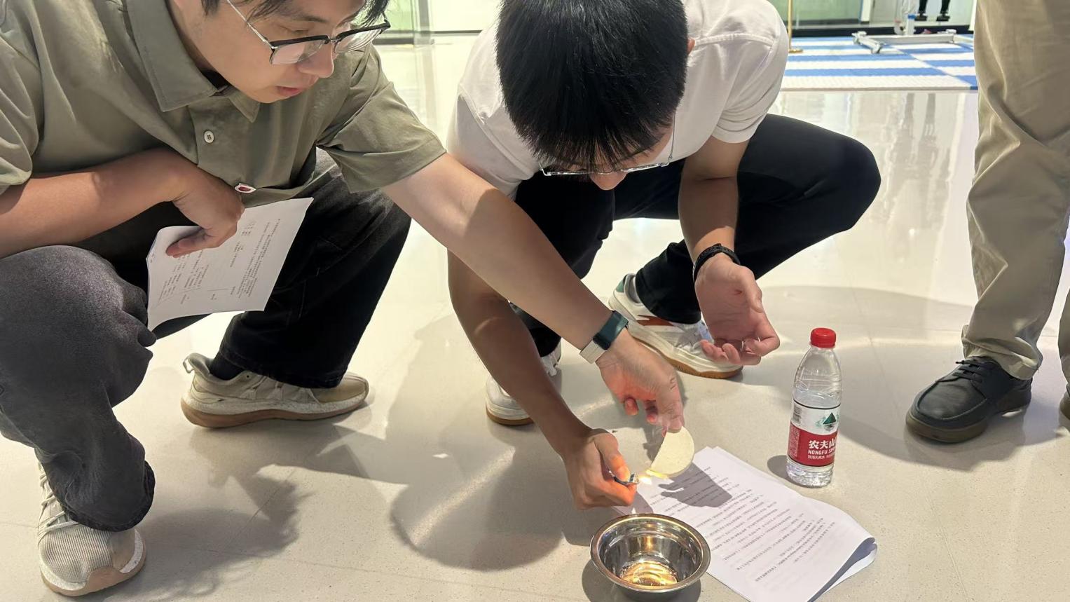 为贴近真实火场环境,演练设置烟饼模拟场景。烟雾弥漫中,师生实践低姿撤离、湿毛巾捂口鼻等自救技能,进一步强化在浓烟环境下的应急反应与防护意识